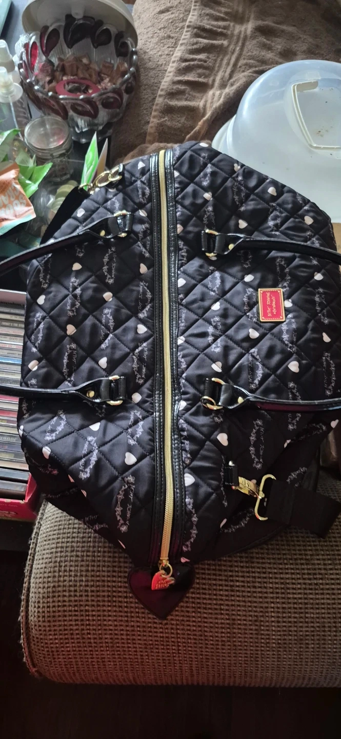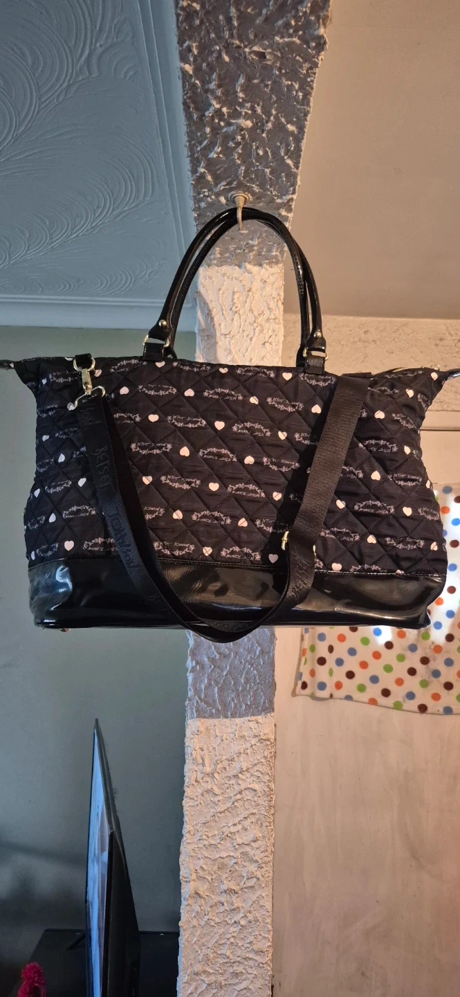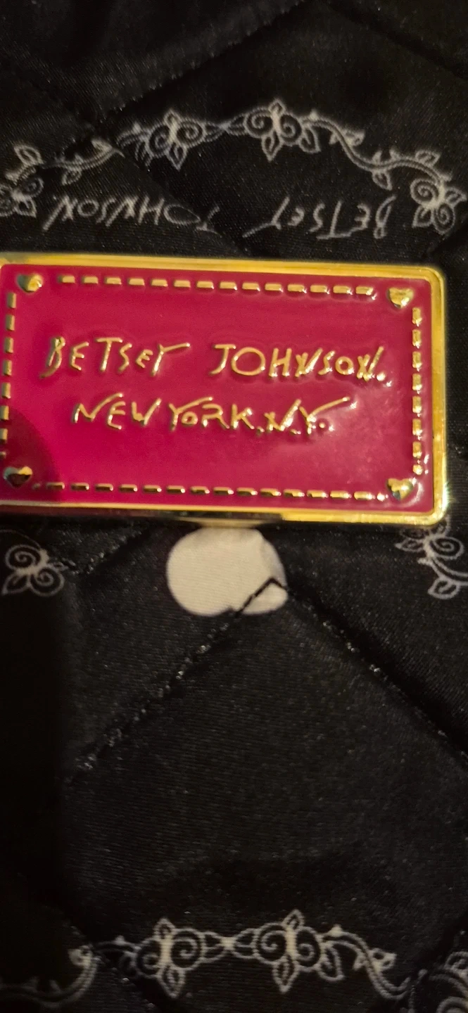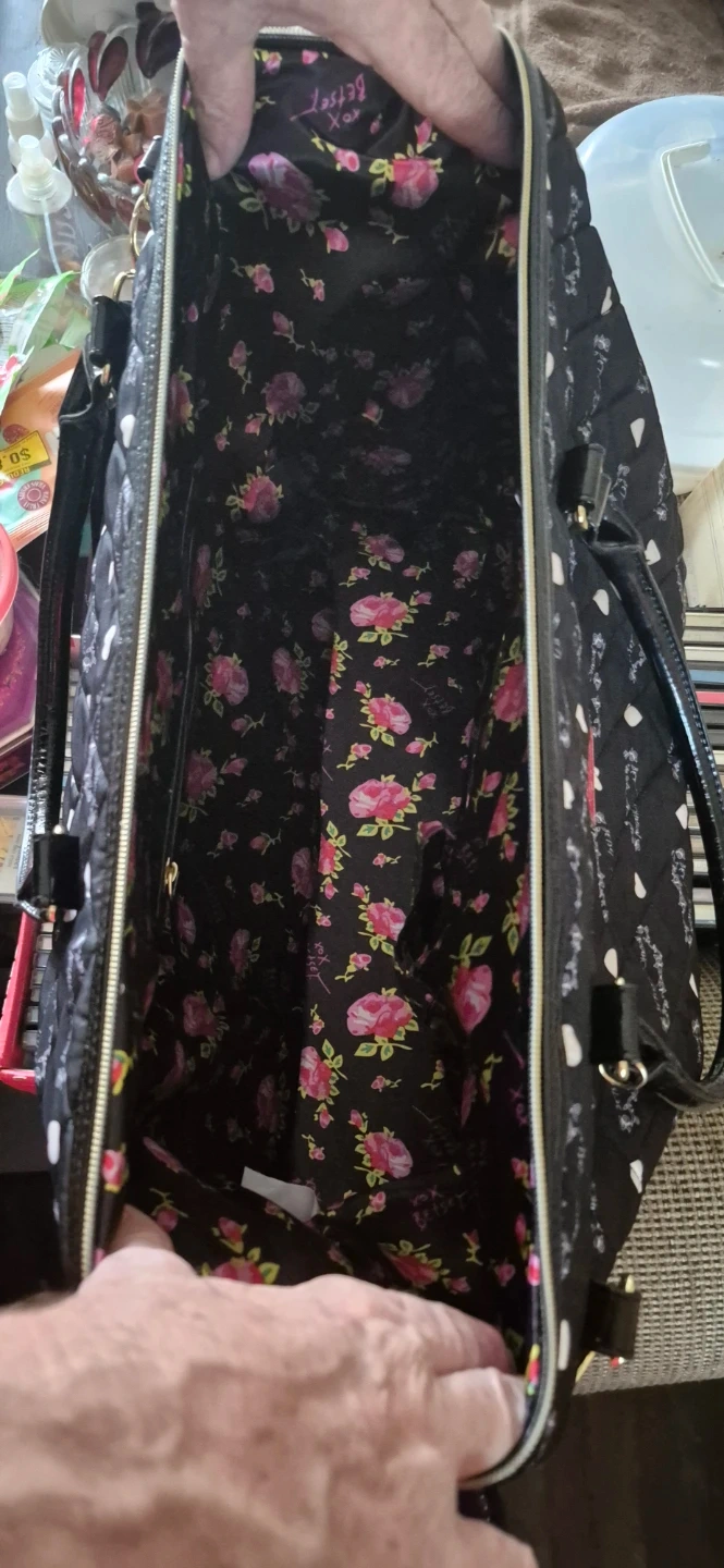 This is a black quilted tote bag by Betsey Johnson. New York /NY. It features a patterned exterior and a floral print interior. Comes with a shoulder strap and gold-tone hardware, including a heart-shaped zipper pull. Can be worn as a shoulder bag or carried as a tote. In Mint Condition, clean, no tares, rips. Lovingly taken care of. Ready to add some flair to your outfit.