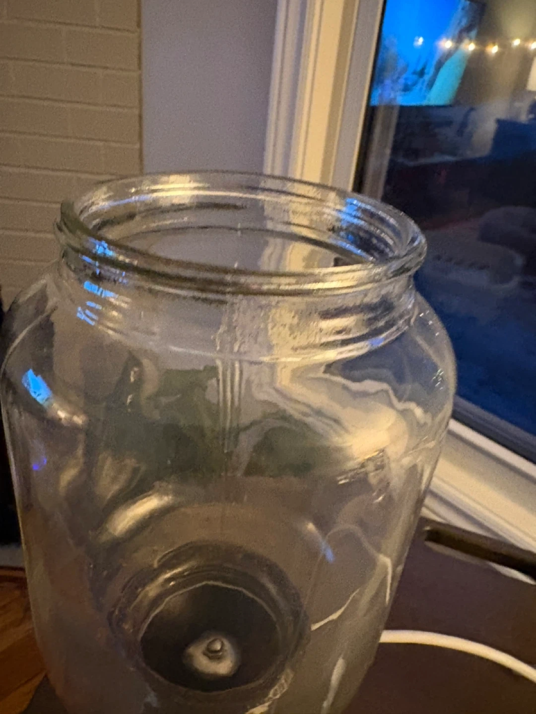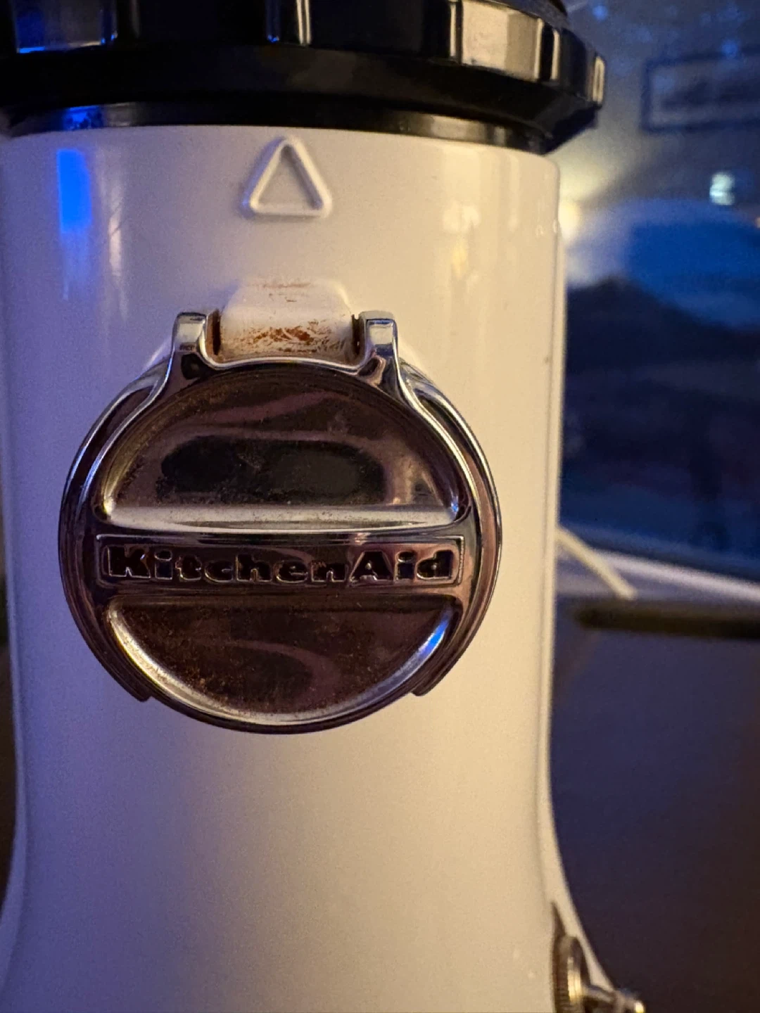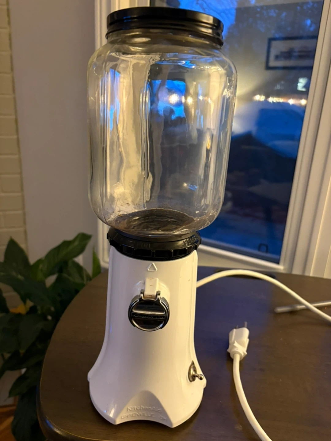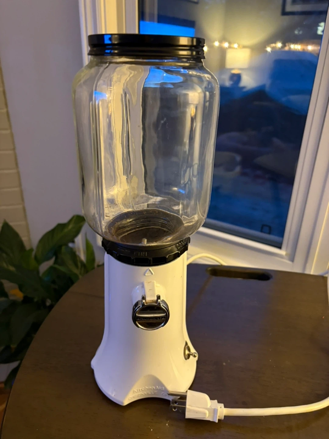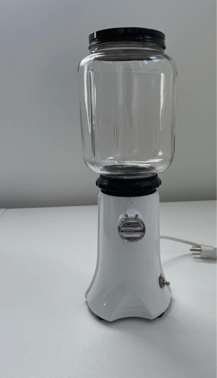 KitchenAid coffee grinder with a glass jar. It has a dial for grind settings, from fine to coarse. This grinder is great for fresh coffee grounds. Works well!