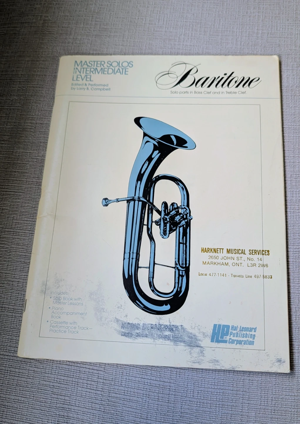 This music book features baritone solos for the intermediate level, compiled and performed by Larry B. Campbell. It includes a songbook with master lessons, accompaniment, and a cassette with practice track. A great resource for developing baritone players!