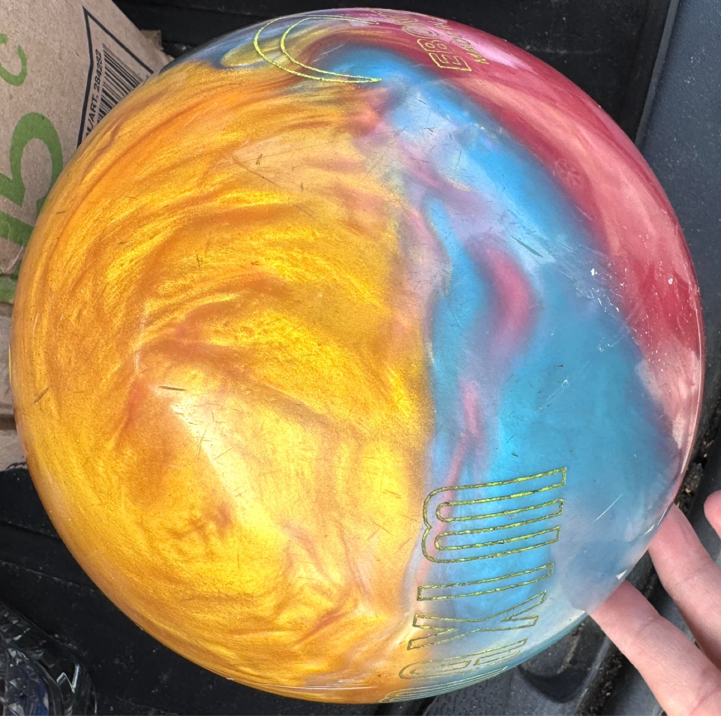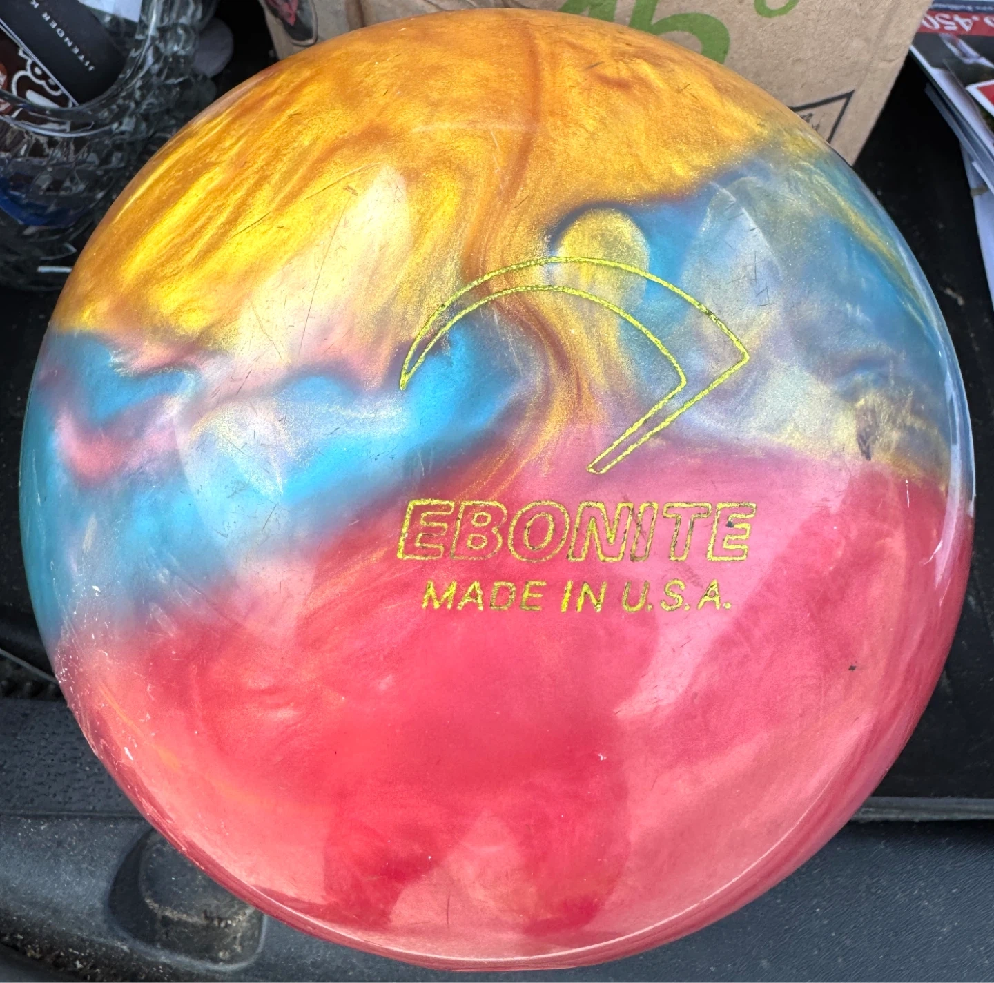 This is an Ebonite bowling ball with a vibrant swirled red, blue, and gold finish. It's made in the U.S.A. and features the "WIX H W" model name. It has three finger holes for grip.