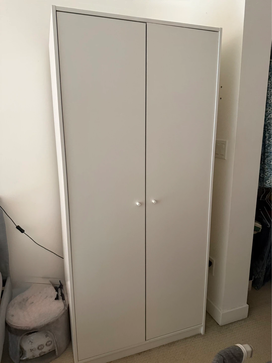 White wardrobe with two doors and silver knobs. It's a good size for a bedroom. Ideal for storing clothes and accessories!