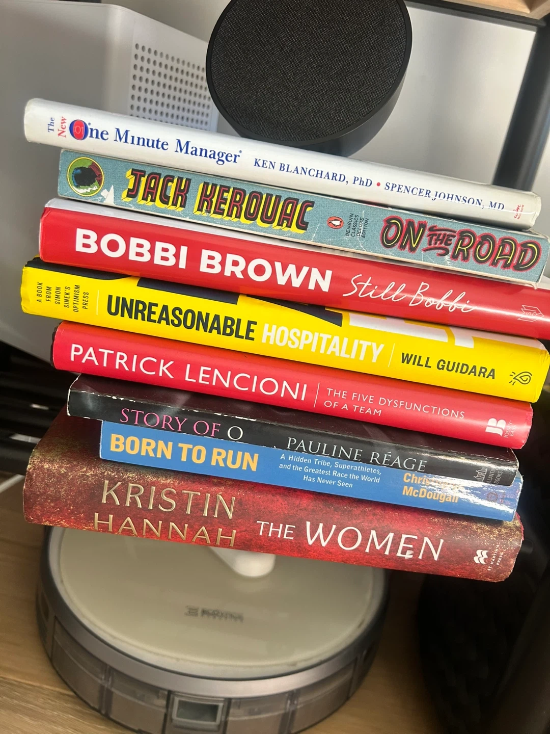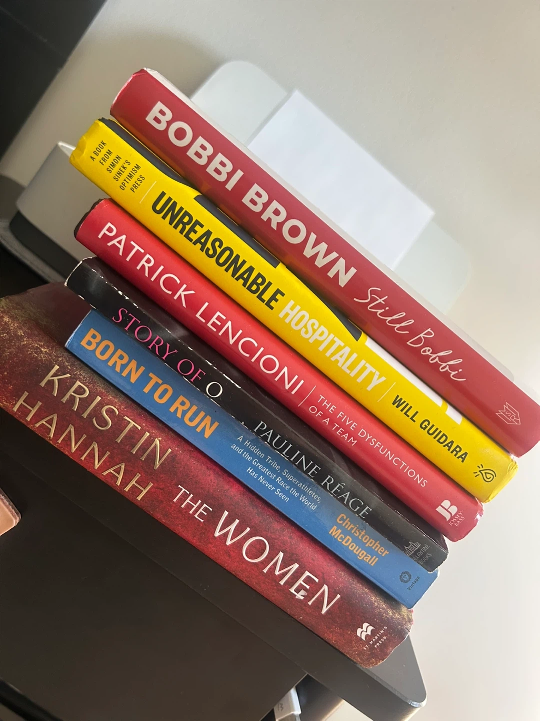 Bundle of books including 'Still Bobbi' by Bobbi Brown, 'Unreasonable Hospitality' by Will Guidara, 'The Five Dysfunctions of a Team' by Patrick Lencioni, 'Story of O' by Pauline Reage, 'Born to Run' by Christopher McDougall, and 'The Women' by Kristin Hannah. One Minute Manager (not pictured but just added) All in great condition!