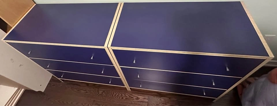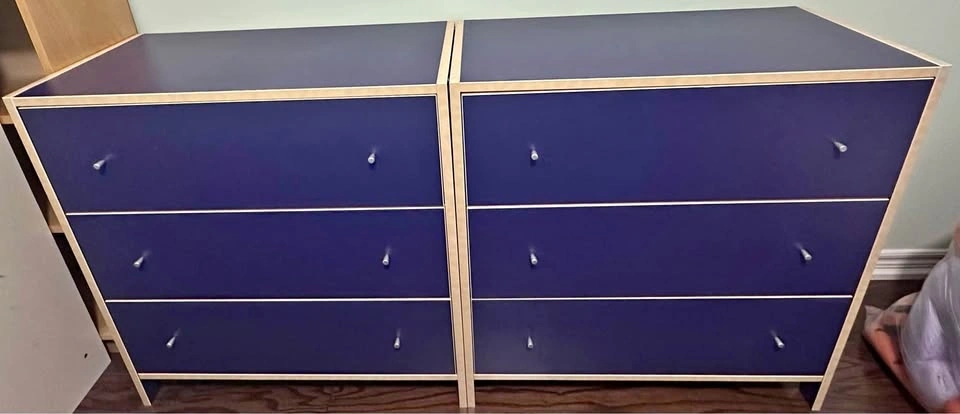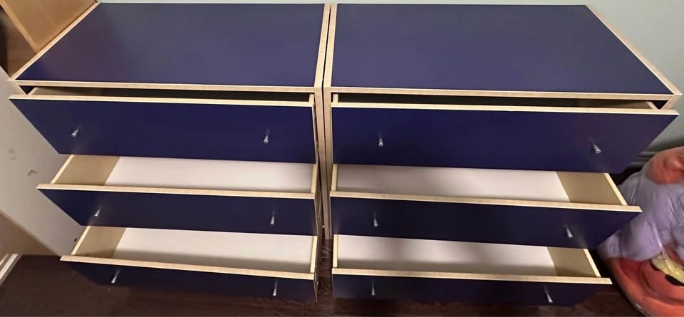 Selling a matching set of 2 modern navy blue dressers. Sleek, stylish design that adds a bold touch to any bedroom. Both are in good cosmetic condition with normal wear from many years of use (see photos). Spacious drawers for plenty of storage. Set of 2 – great value. Modern navy finish. Move-out sale – priced to sell. Asking $90. Pickup only.