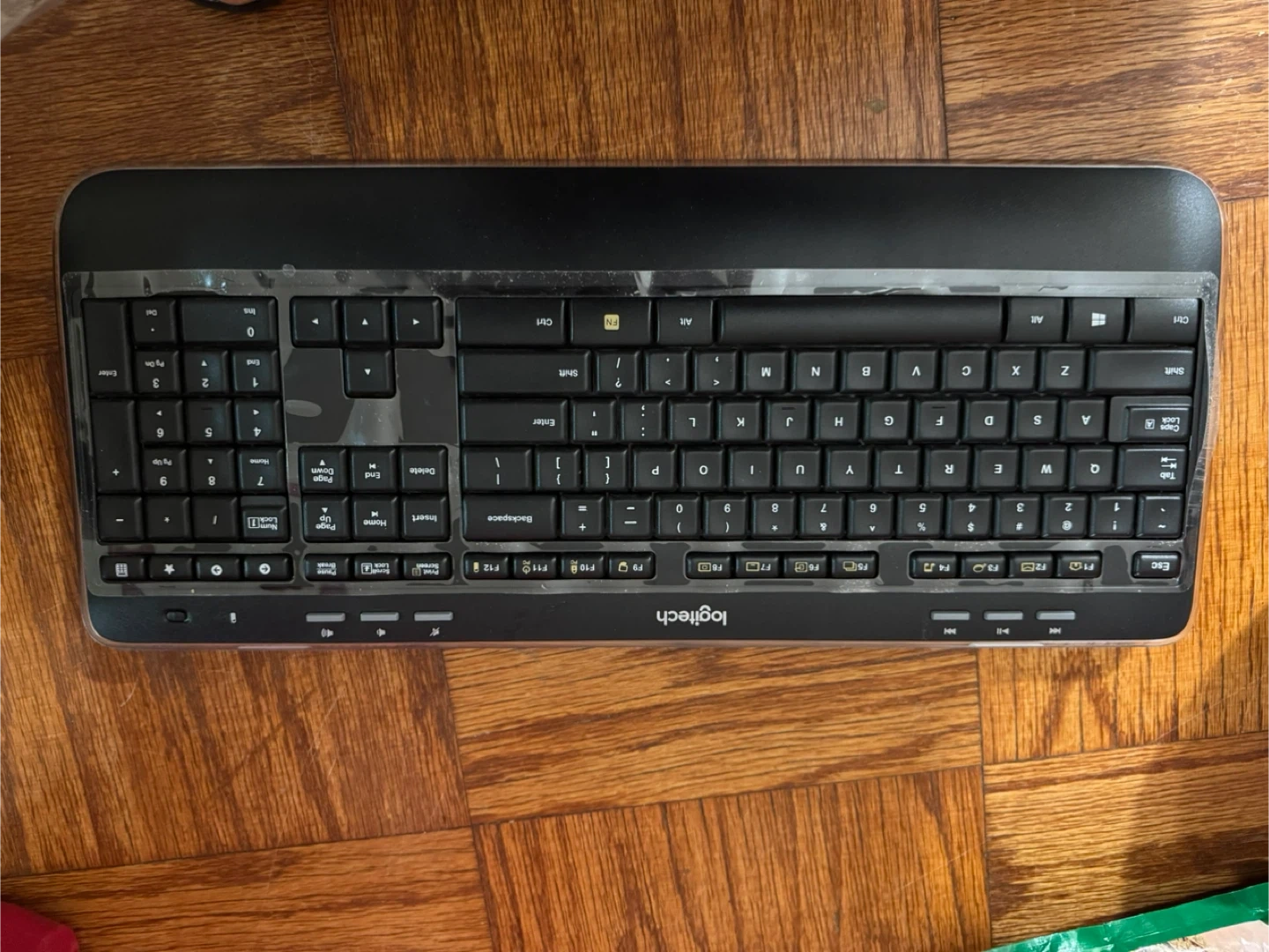 This is a Logitech wireless keyboard. It's black and has a full QWERTY layout. It's a standard-size keyboard with mouse and dongle.