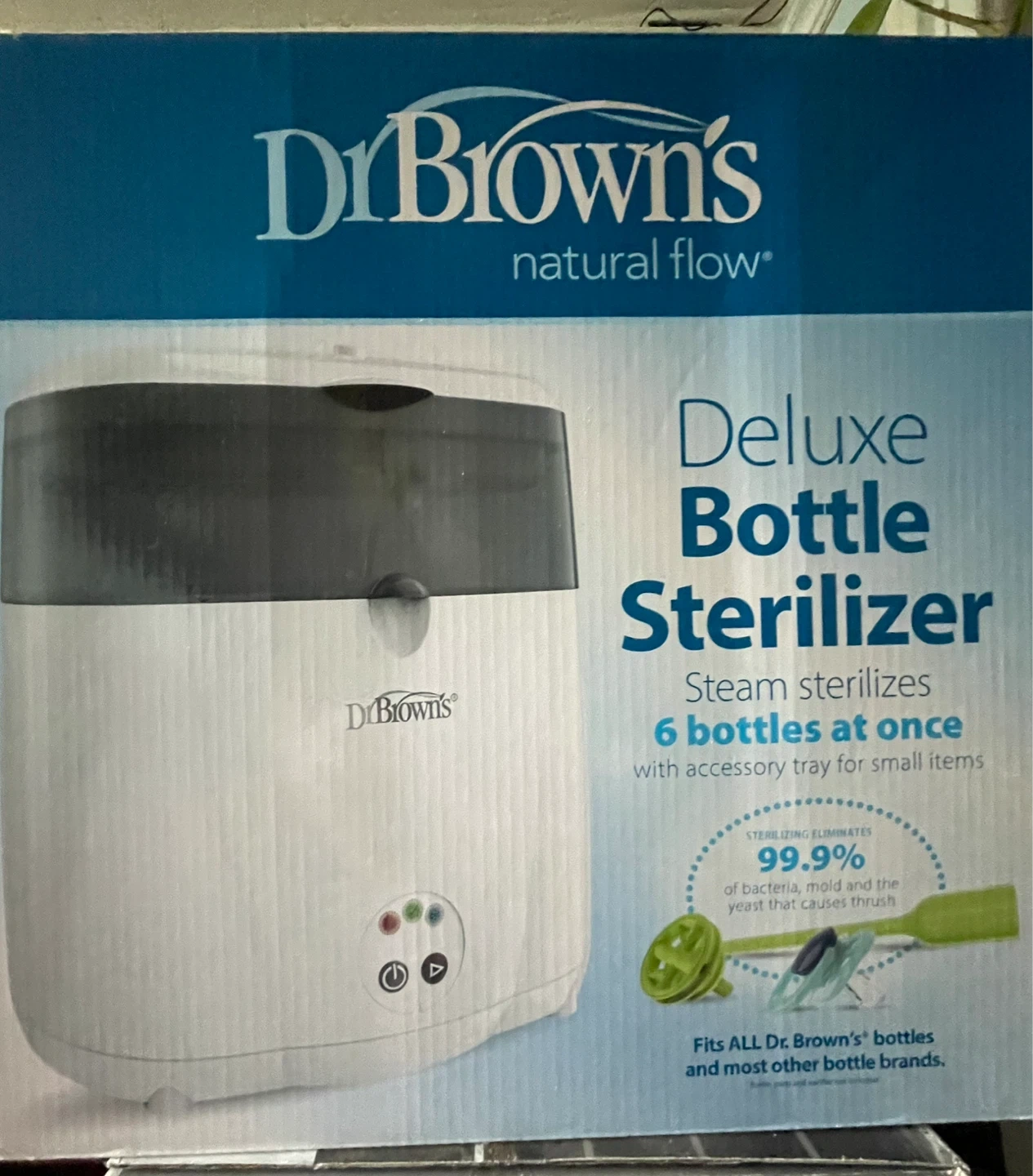 Dr. Brown's Deluxe Bottle Sterilizer, model AC045. It's a bottle sterilizer for baby bottles. Includes a measuring cup and tongs and its original box.