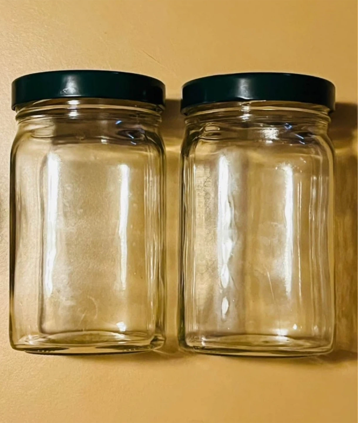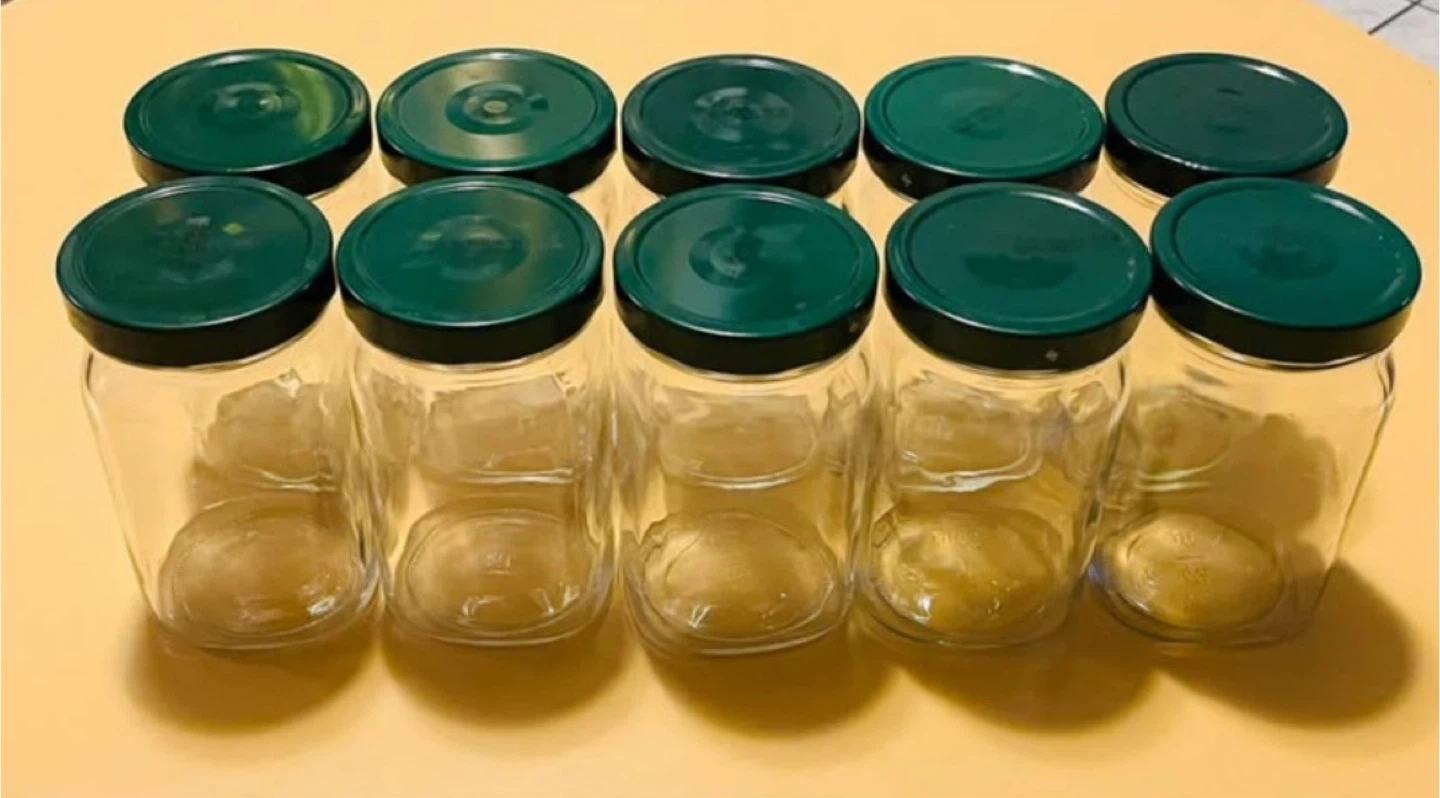 Ten clear glass jars with dark green screw-on lids included. Great for storing preserves, spices, or craft supplies. These jars are reusable and ready for your next project!