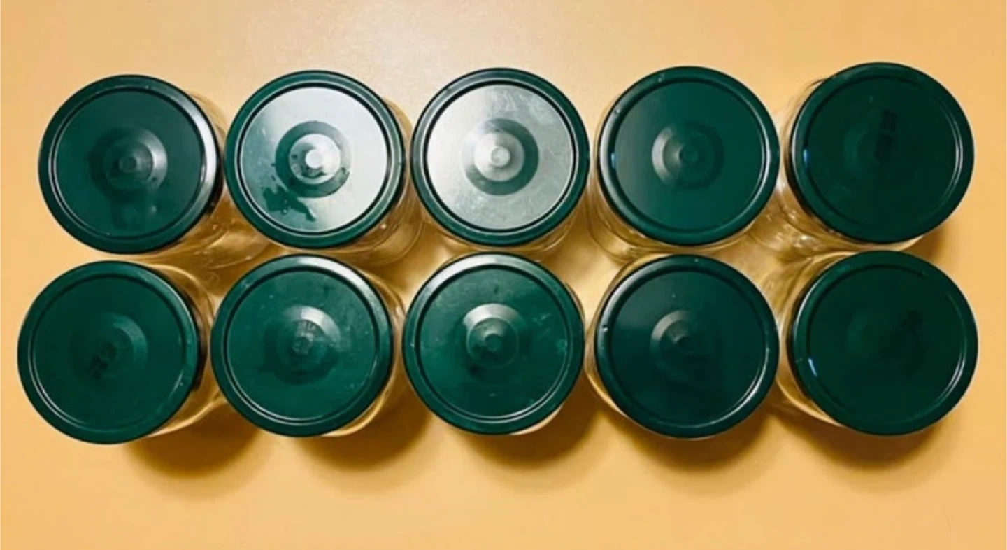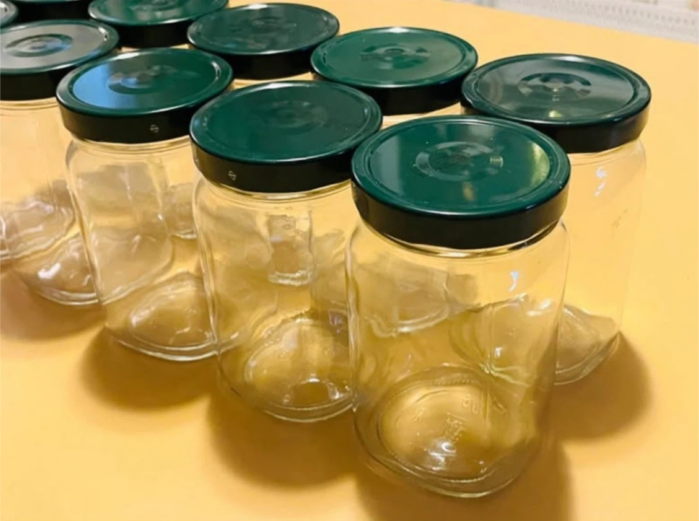 Set of 10 Clear Glass Jars with Green Lids