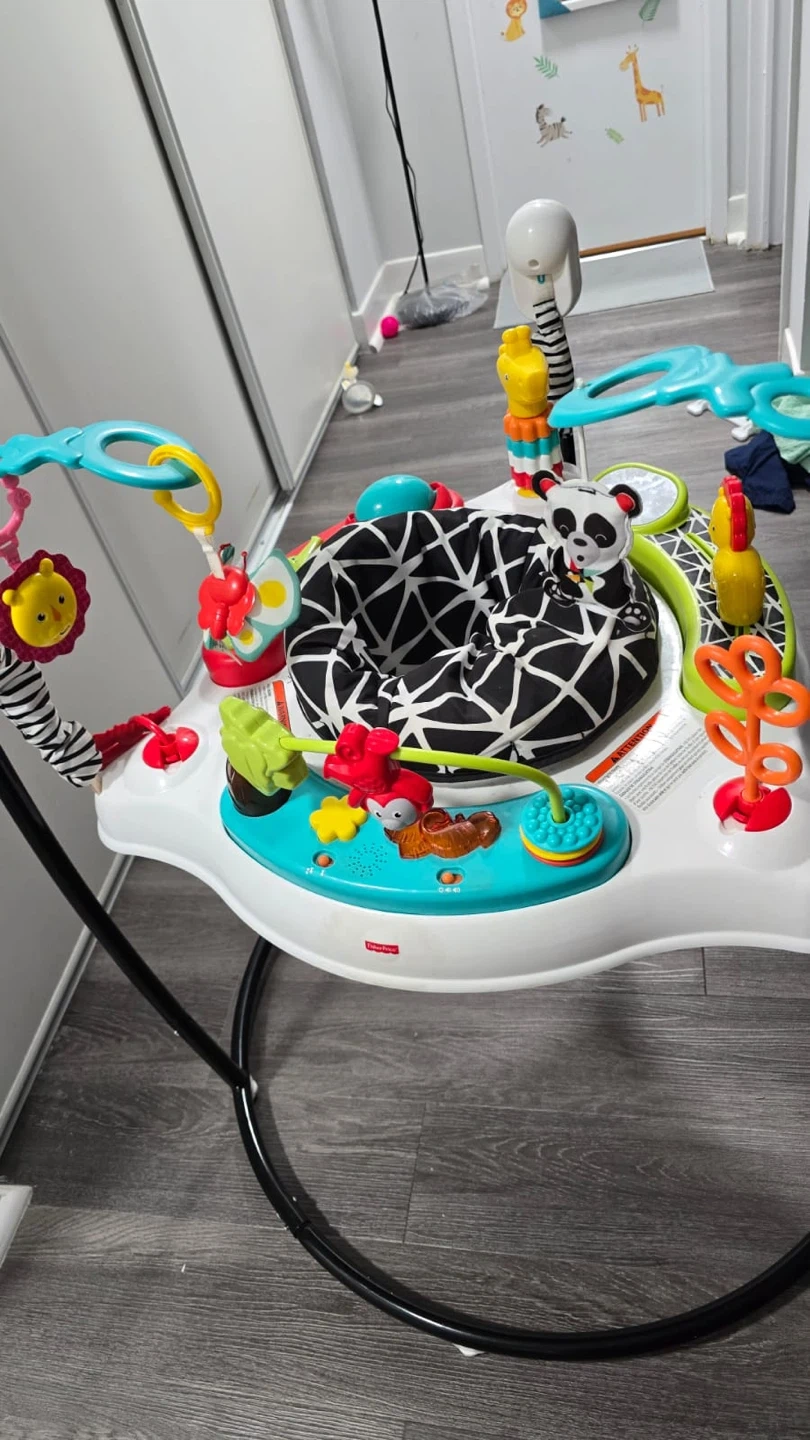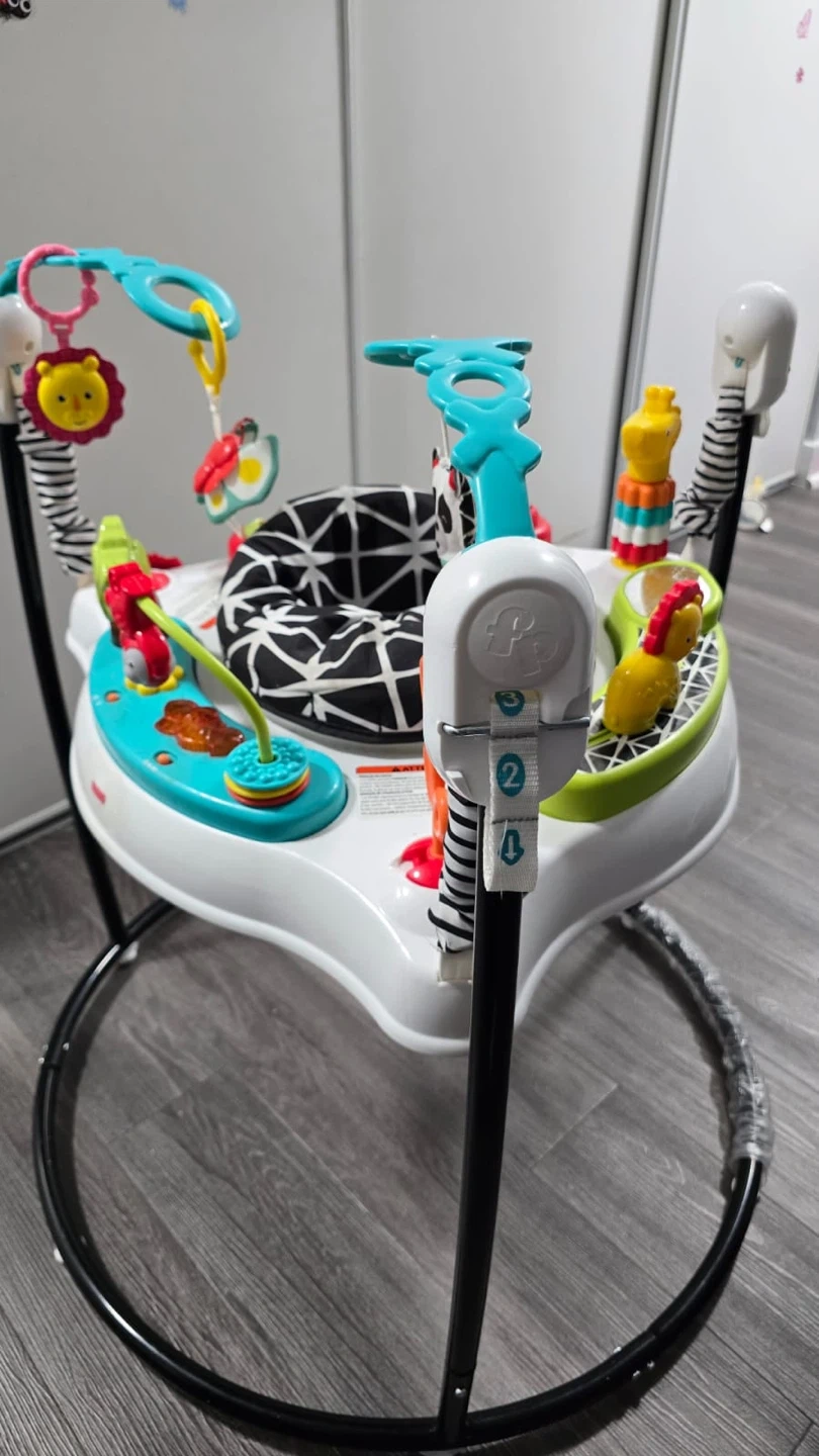 This Fisher-Price Jumperoo provides a fun and engaging experience for little ones. It features a variety of hanging toys and interactive elements. The seat is comfortable and rotates 360 degrees for full access to play. It's designed for babies who can hold their heads up unassisted.