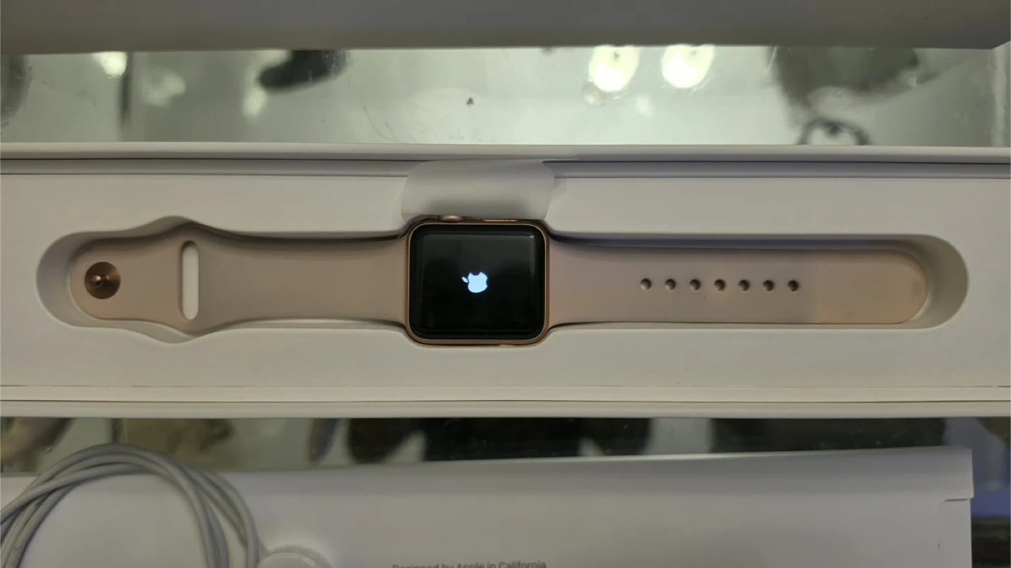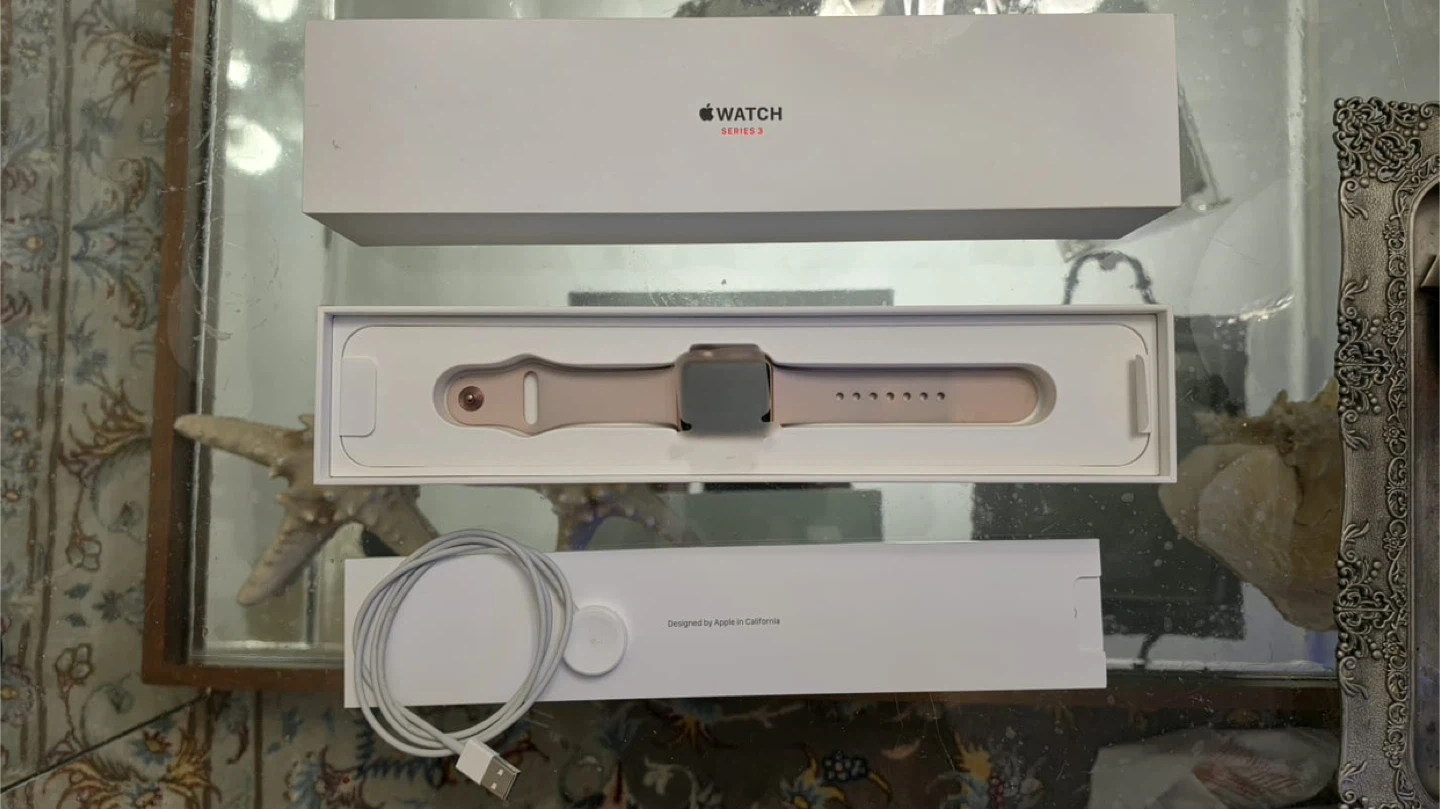 Apple Watch Series 3 in rose gold aluminum case with a pink sand sport band. Includes original box, charging cable, and magnetic charging puck. 38mm GPS + cellular