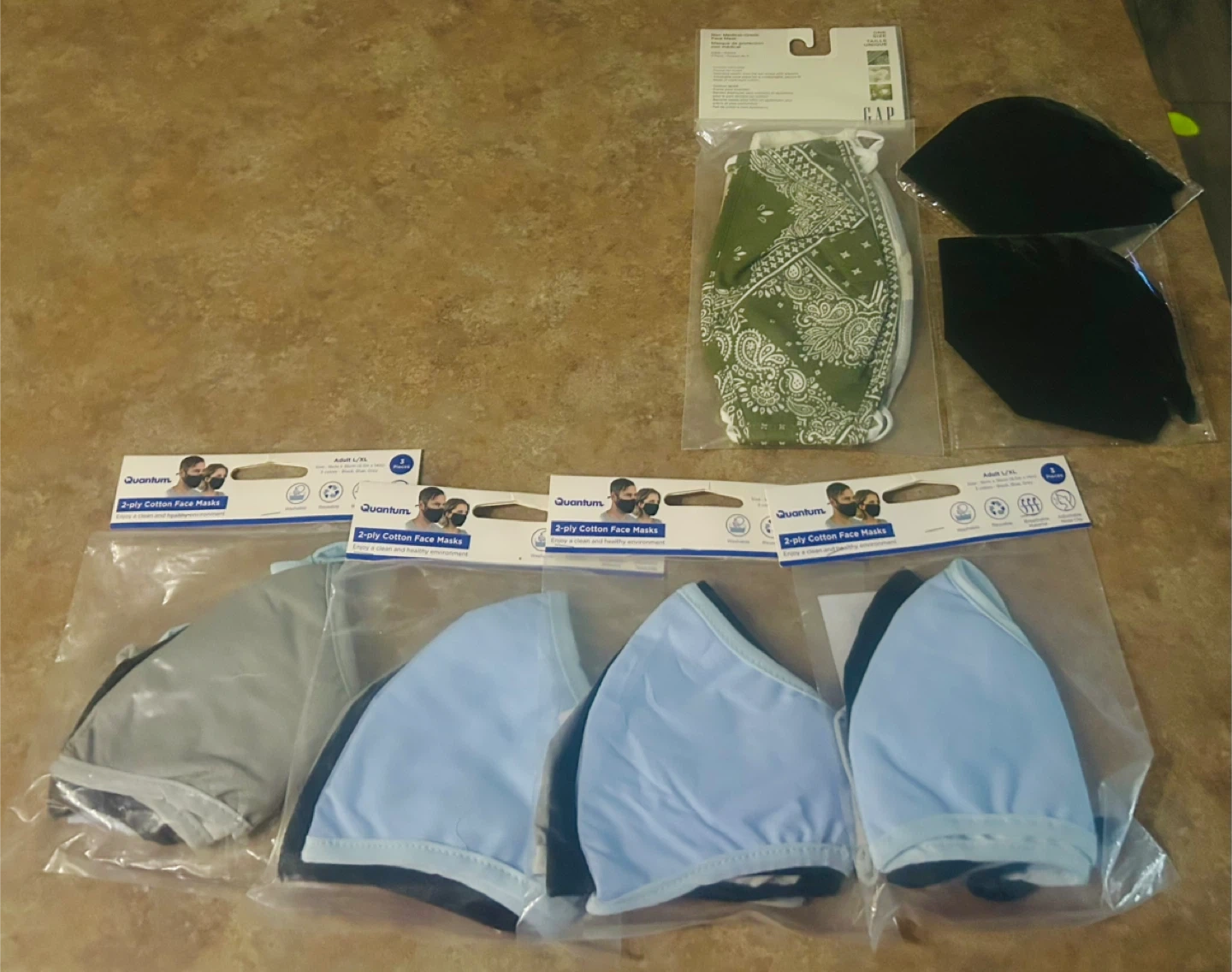 (3 each), a 3 pack of GAP face masks, and 2 individual black ones.