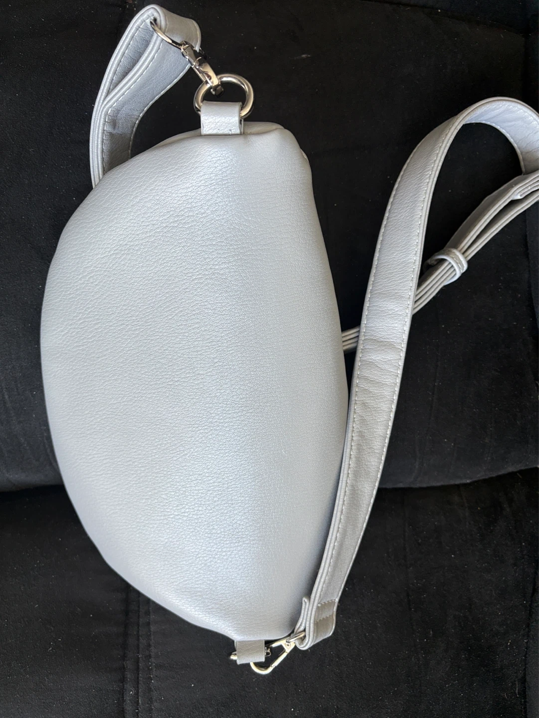 This grey fanny pack is made from faux leather. It features a main zippered compartment with an interior zippered pocket. Includes an adjustable strap.