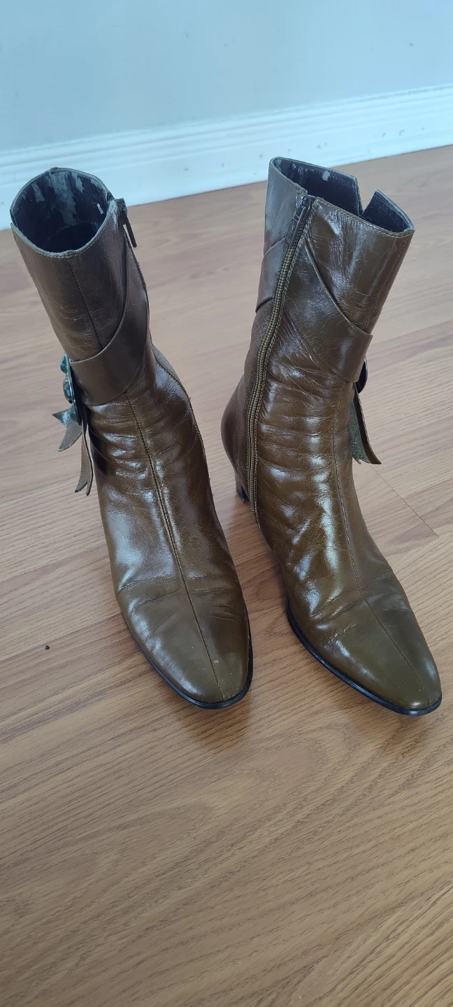 Stylish genuine leather ankle boots with a decorative jewelled buckle. They're ankle height with a side zipper closure and a pointed toe. Heel height is approximately 2 inches. The ankle area is tight, so these are only for thin ankles.