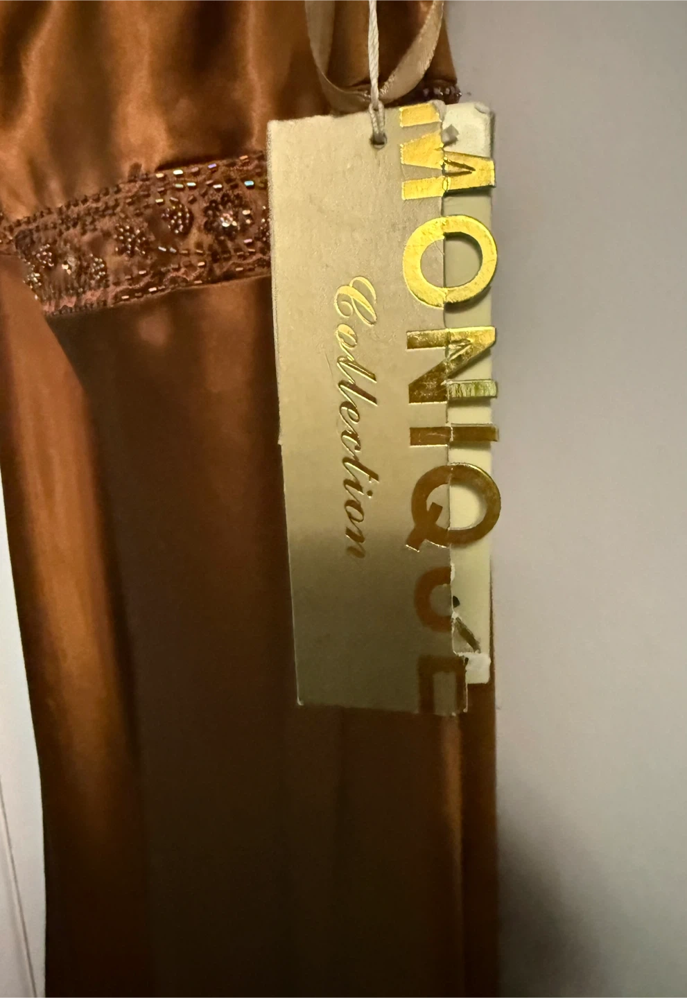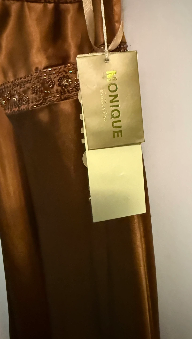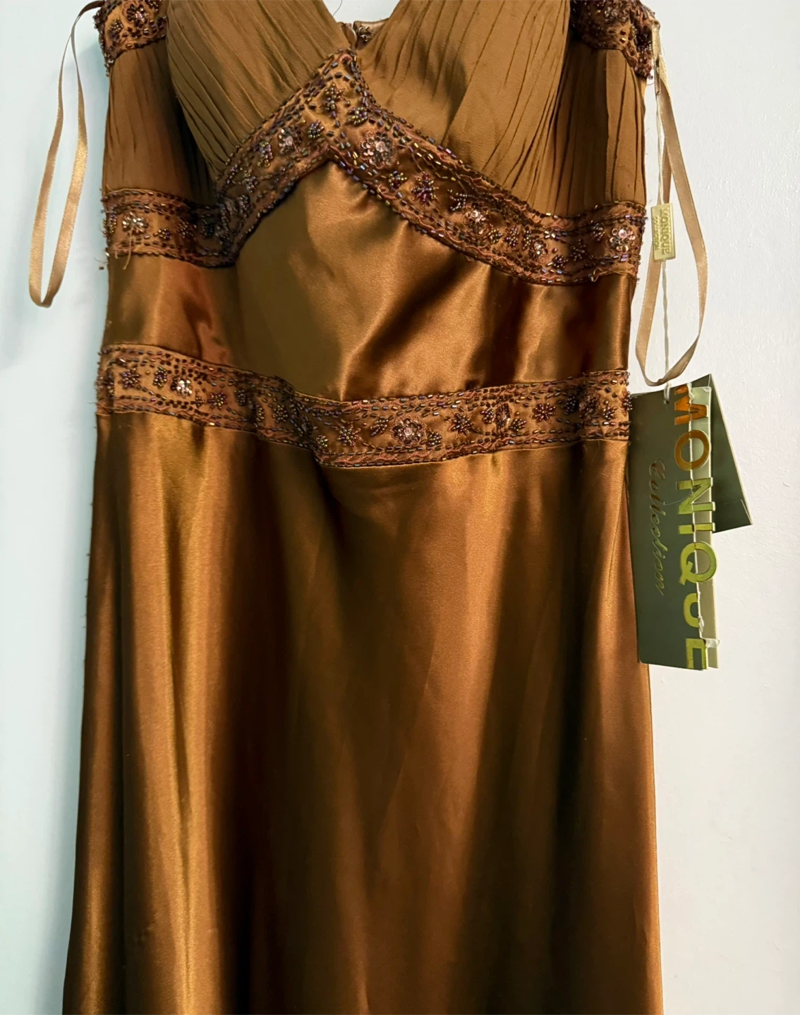 This is a stunning Monique dress, brand new with tags, featuring intricate beading and a flattering silhouette, perfect for any special occasion.
