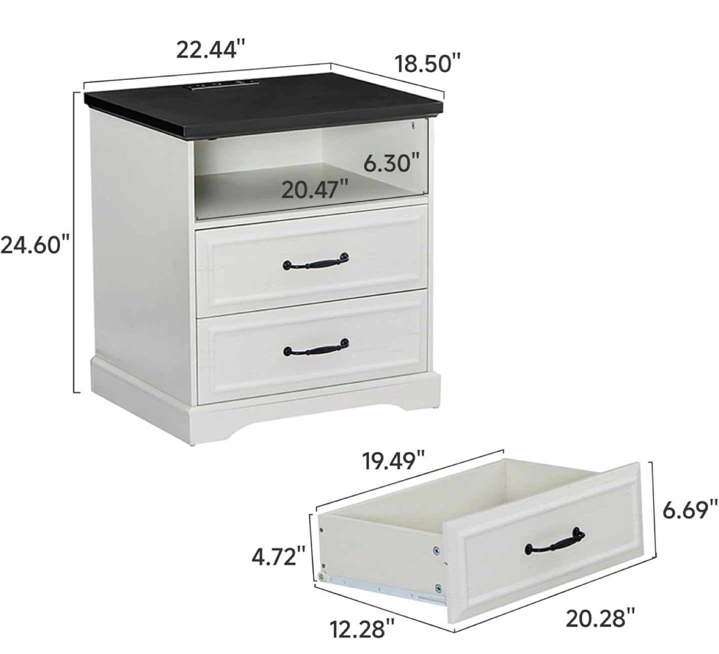 This nightstand features a white cabinet with a black top and two drawers with metal handles. It includes an open shelf and a recessed power strip with 2 AC outlets, 2 USB ports, and a 4.9 ft cord. Dimensions: 22.44" W x 18.50" D x 24.60" H. Drawer interior: 19.49" W x 12.28" D x 6.69" H. Open shelf interior: 20.47" W x 6.30" H.