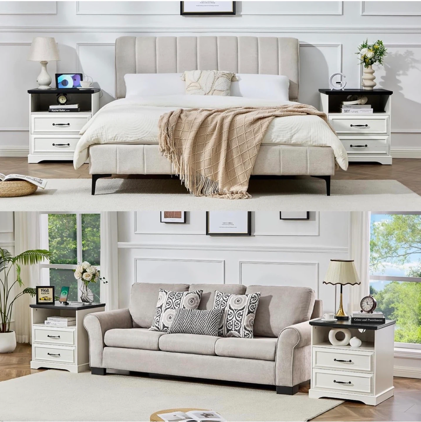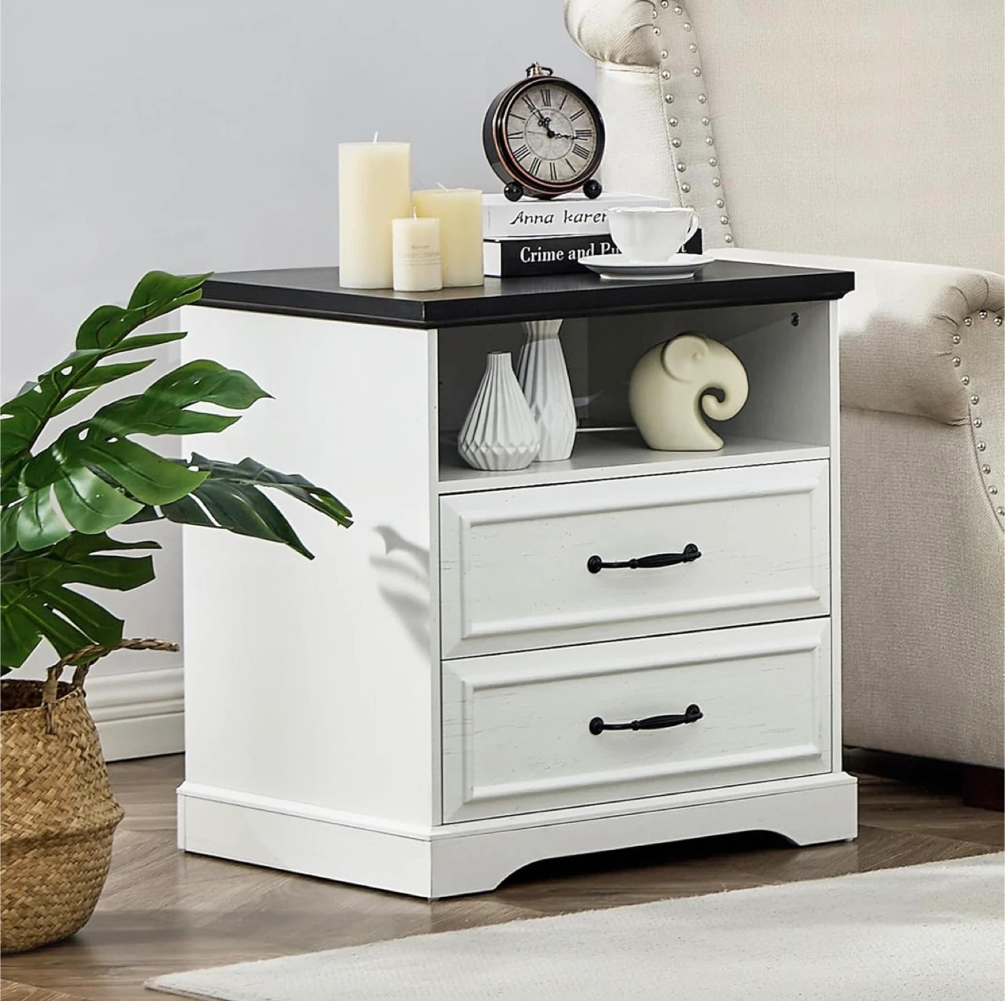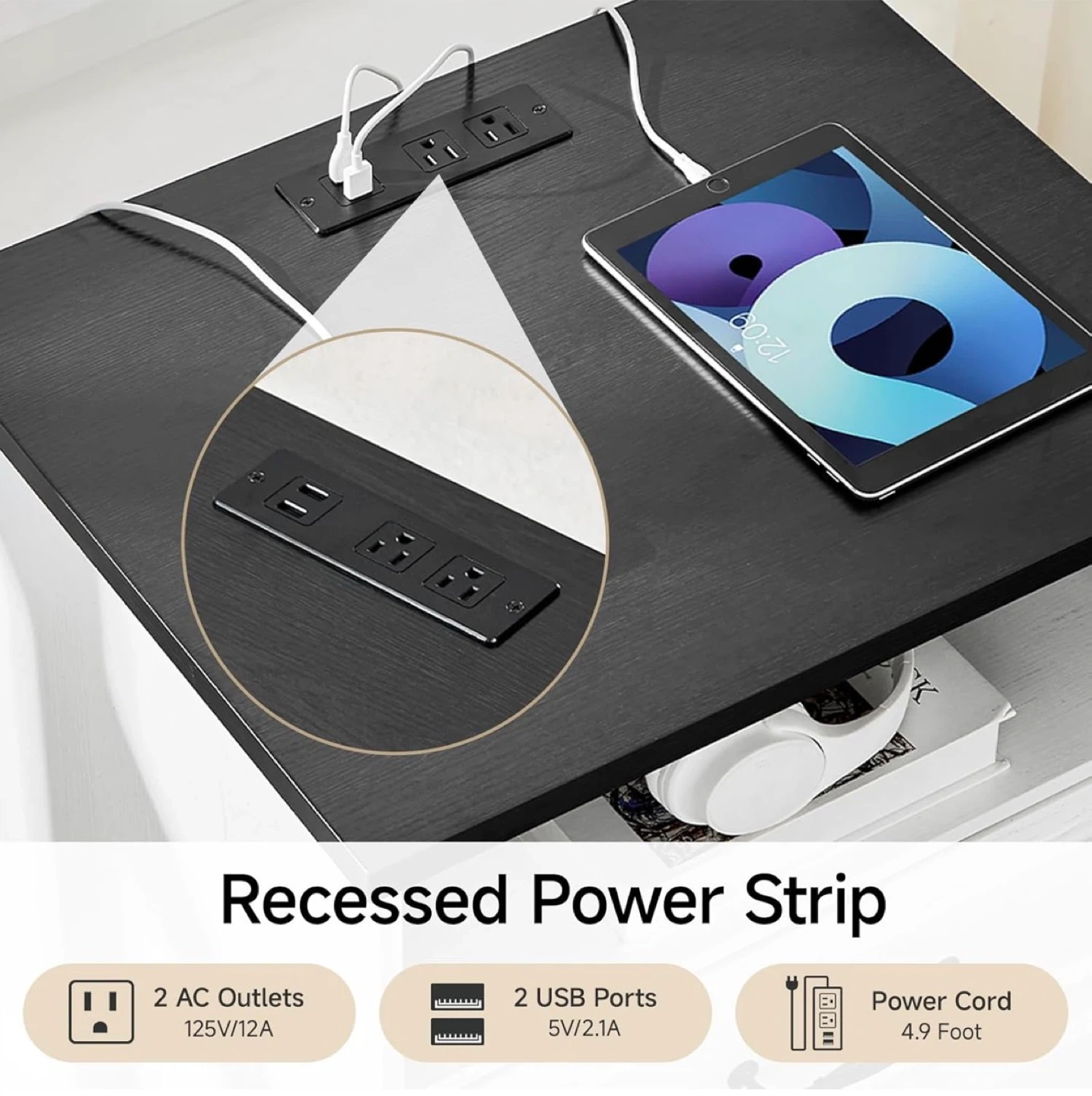 White & Black 2-Drawer Nightstand with Built-in Power Strip