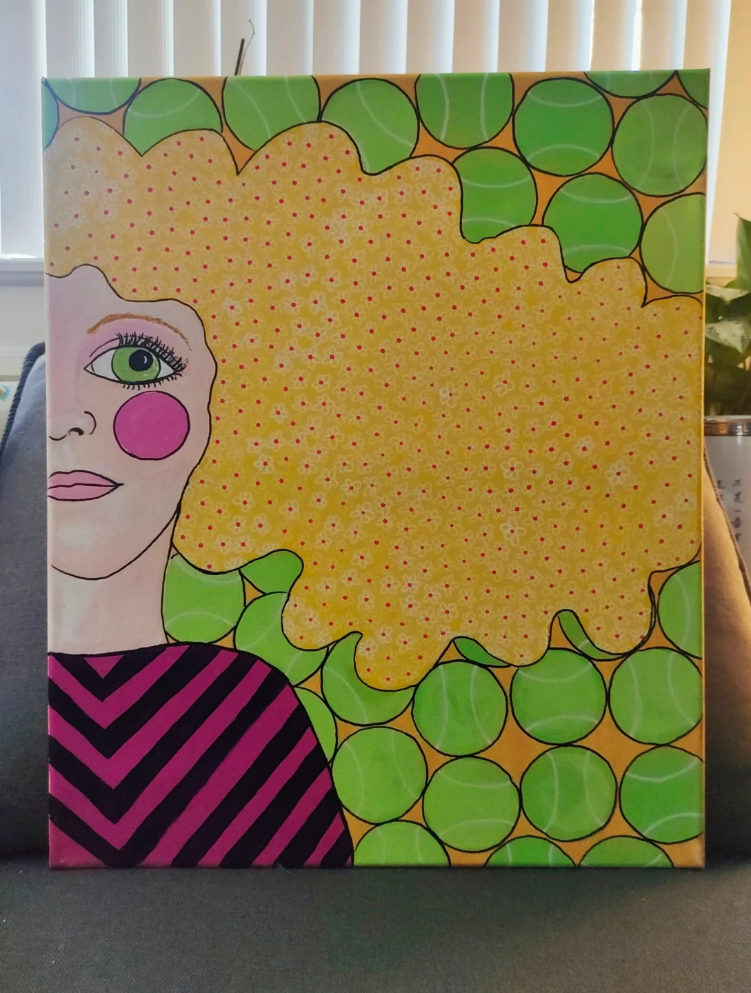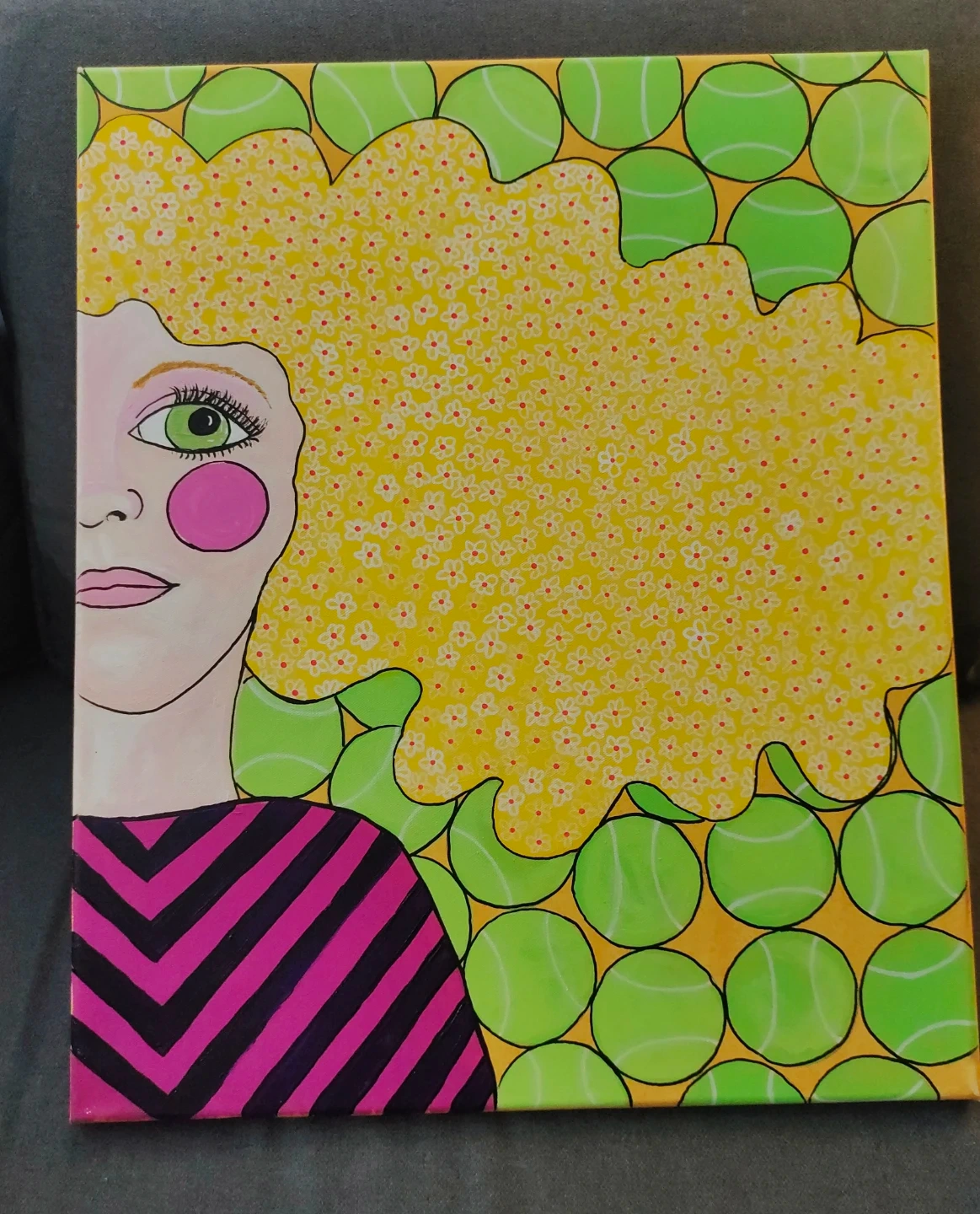 Funky and colourful abstract painting featuring a woman's portrait with a bold, abstract hairstyle. The background incorporates a repeating pattern of green tennis balls and a small floral print. It's a unique piece of wall art for adding a pop of colour and personality to a room.