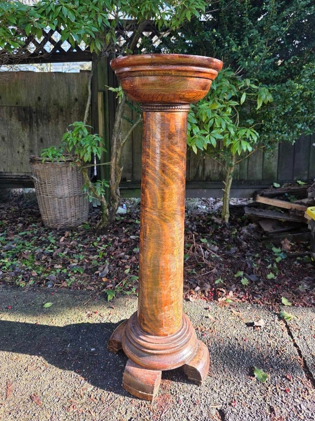 Add a touch of rustic charm to your garden or indoor space with this lovely wooden plant stand! This beautiful piece stands approximately 39 inches tall and features a sturdy 11-inch diameter top, perfect for showcasing your favourite potted plants or decorative items. This is a used item, but it’s in great shape. Here are the approximate measurements: Height: 36 inches, Top Diameter: 11 inches. If the ad is still up, the stand is still available!