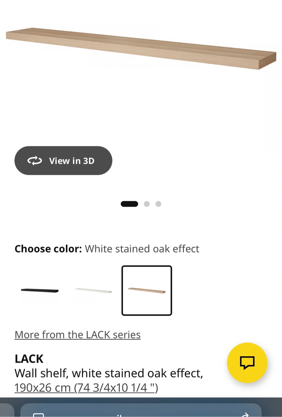 This is an IKEA LACK wall shelf. It's a white stained oak effect finish. The shelf measures 190x26 cm (74 3/4x10 1/4 "). It's perfect for displaying books or decorative items.