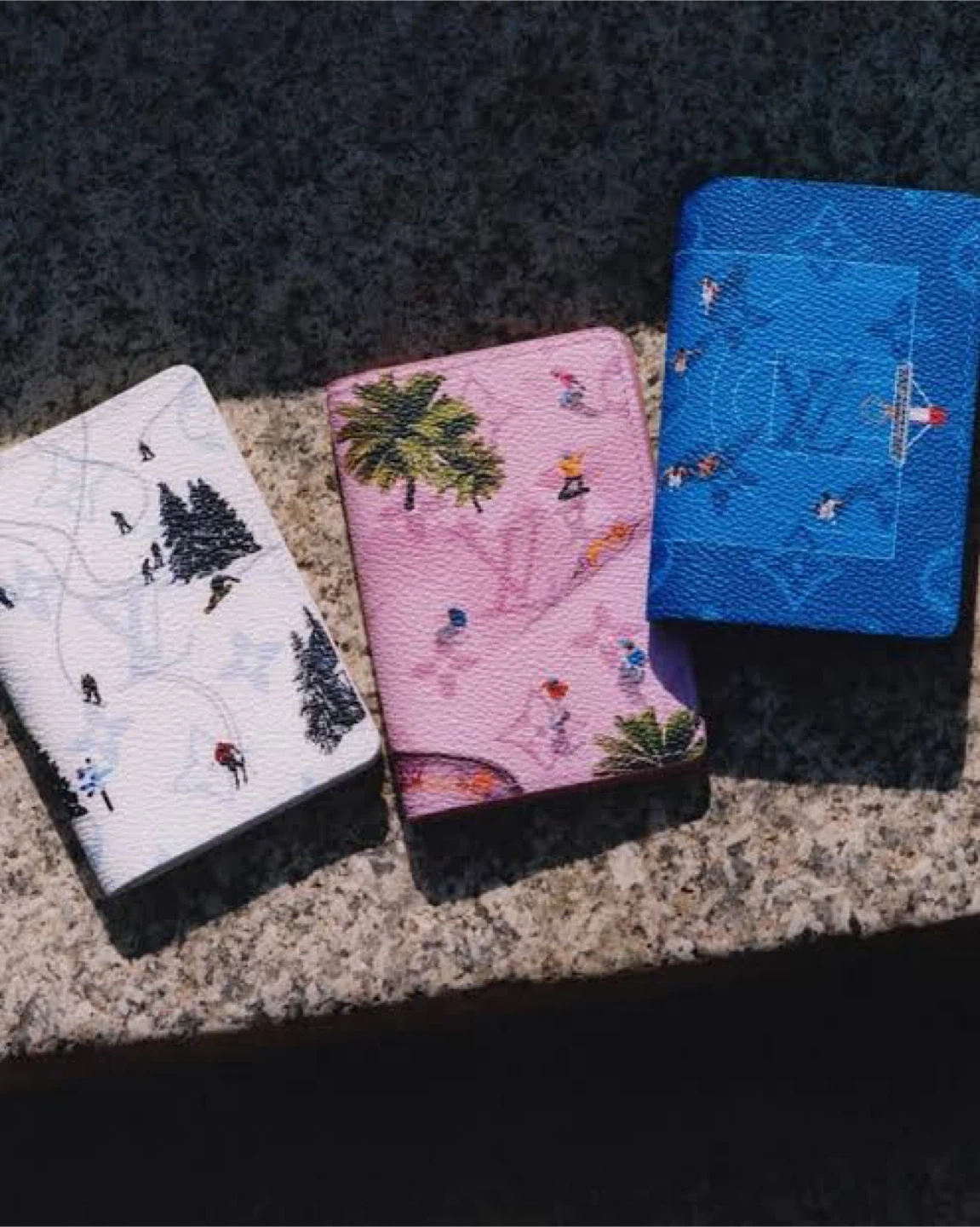A set of three Louis Vuitton card holders featuring playful outdoor graphics. These holders showcase ski motifs, tropical scenes, and athletic imagery. Crafted with the brand's signature monogram canvas.