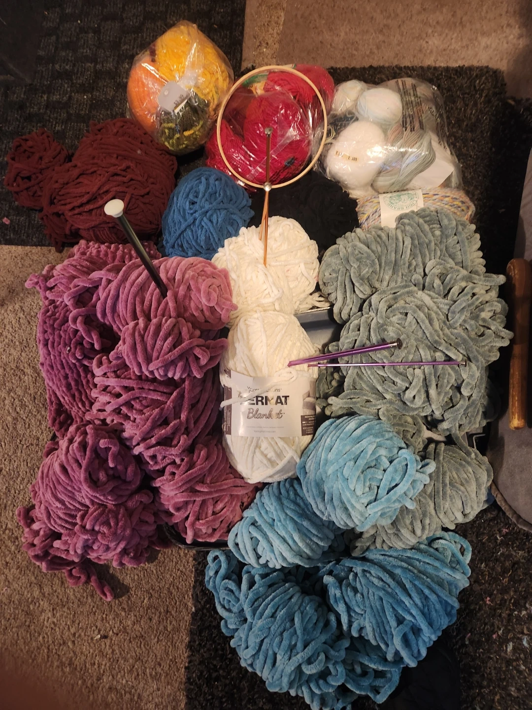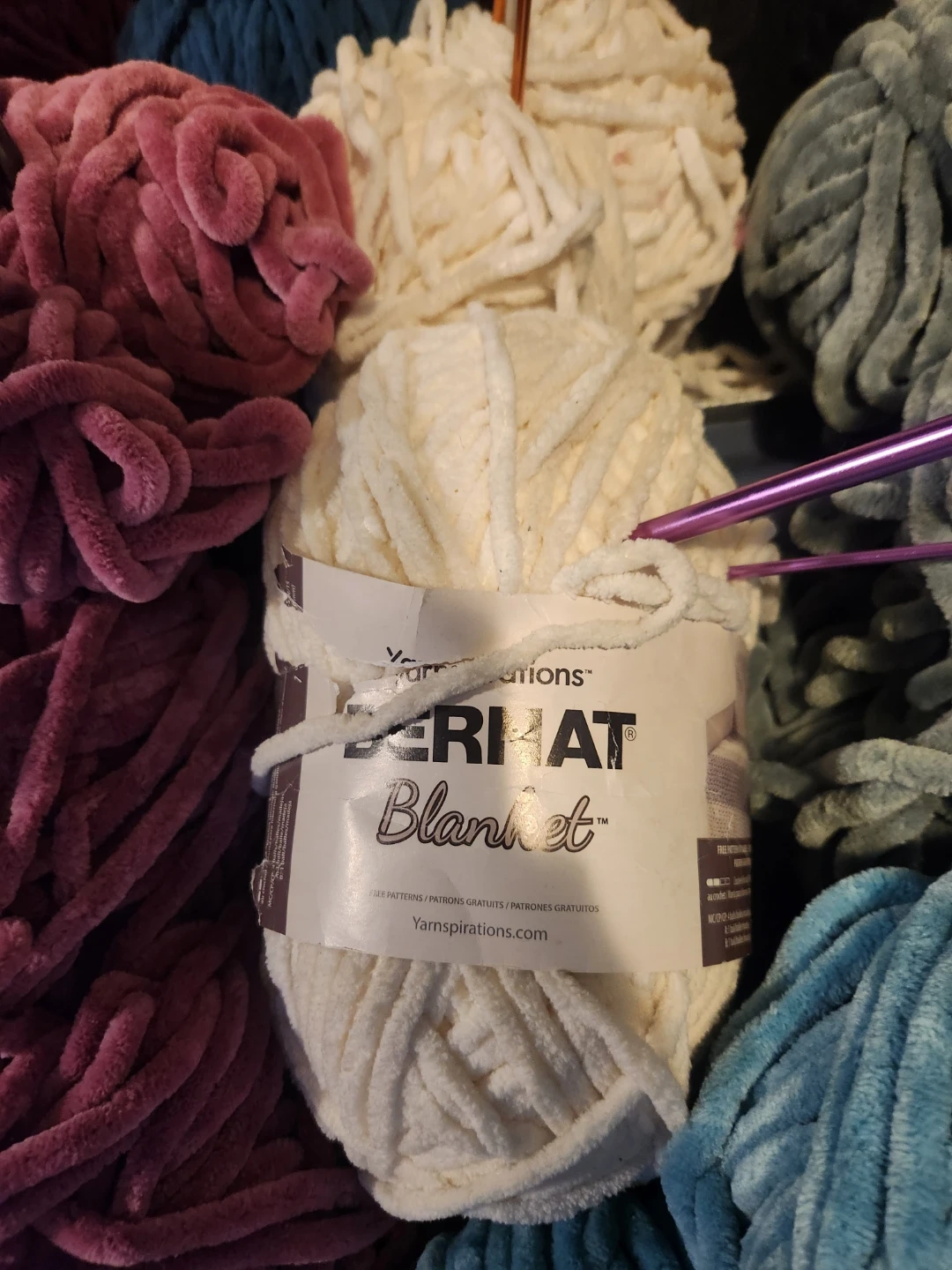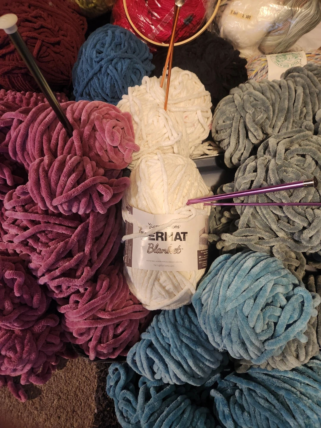 Bundle of Bernat Blanket yarn in multiple colours. Includes shades of purple, maroon, blue, grey, and cream. This yarn is known for its super bulky weight and soft texture, perfect for blankets and cozy projects. Knitting needles are included in some of the bundles.