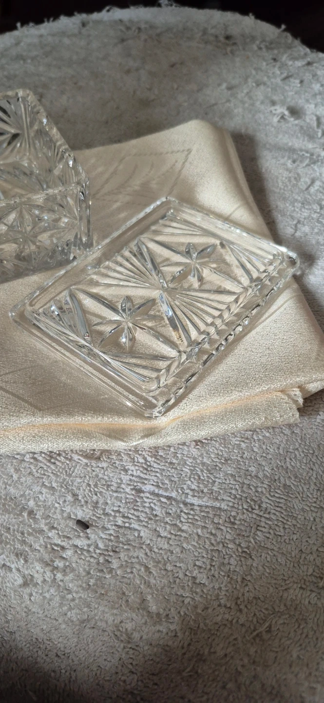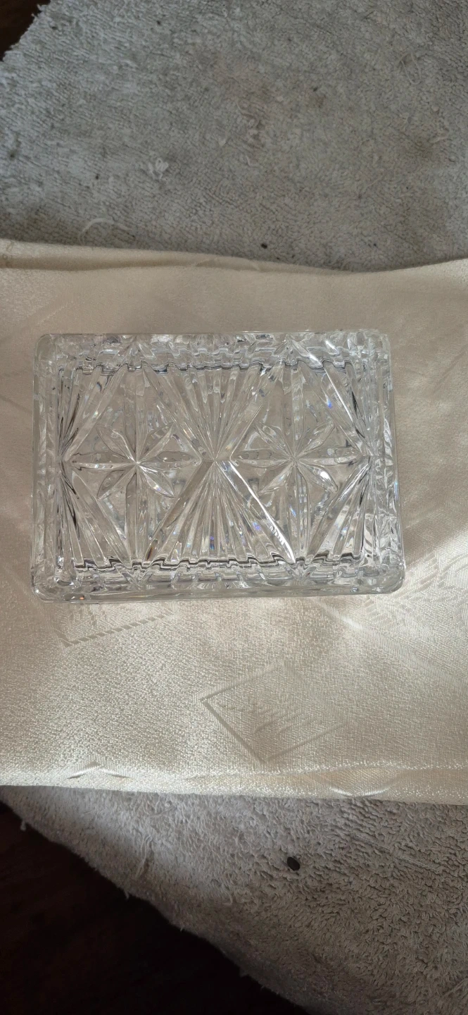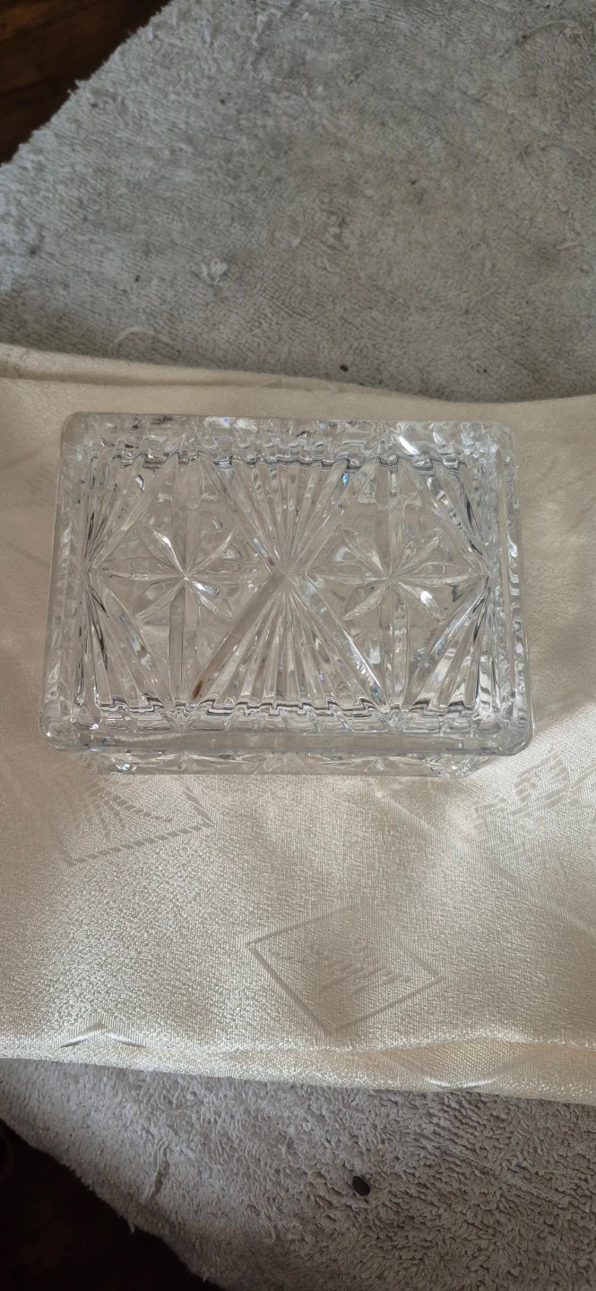 Here's a lovely crystal trinket box with a lid! It's perfect for storing small items or adding a touch of elegance to your space. The box features a beautiful starburst pattern. It's in Mint Condition and ready for a new home.!