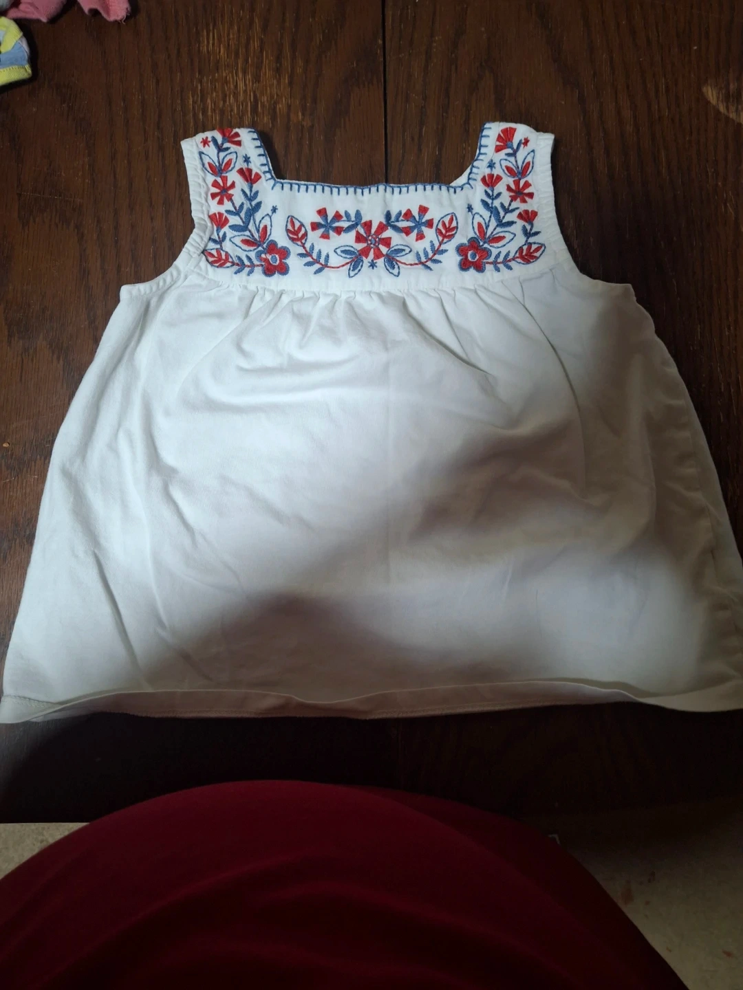 It's a white tank top featuring red and blue floral embroidery around the neckline. The material is soft and breathable. This top would be cute for warmer weather! Size 5T