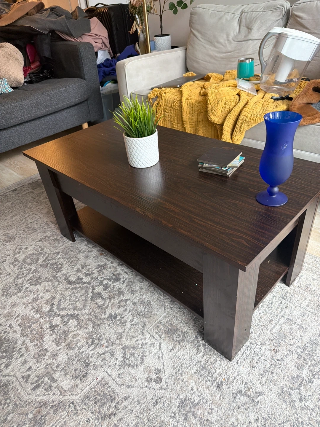 Dark wood coffee table with a lift-top feature for extra workspace or storage. It has a lower shelf for additional display or storage. This table offers a versatile solution for small spaces.