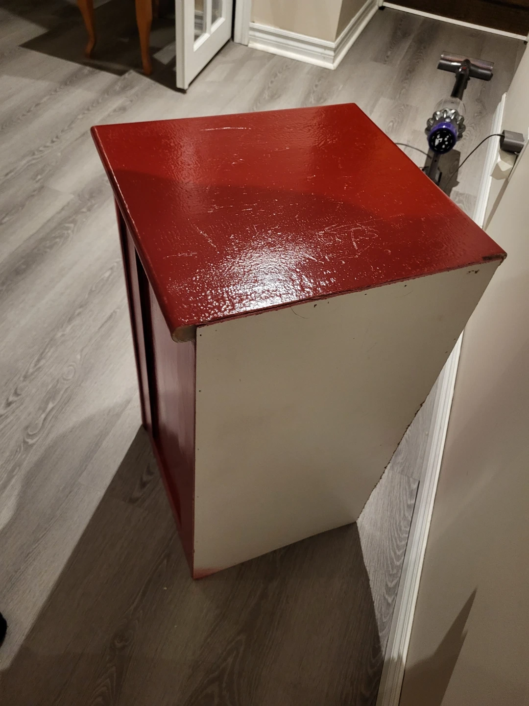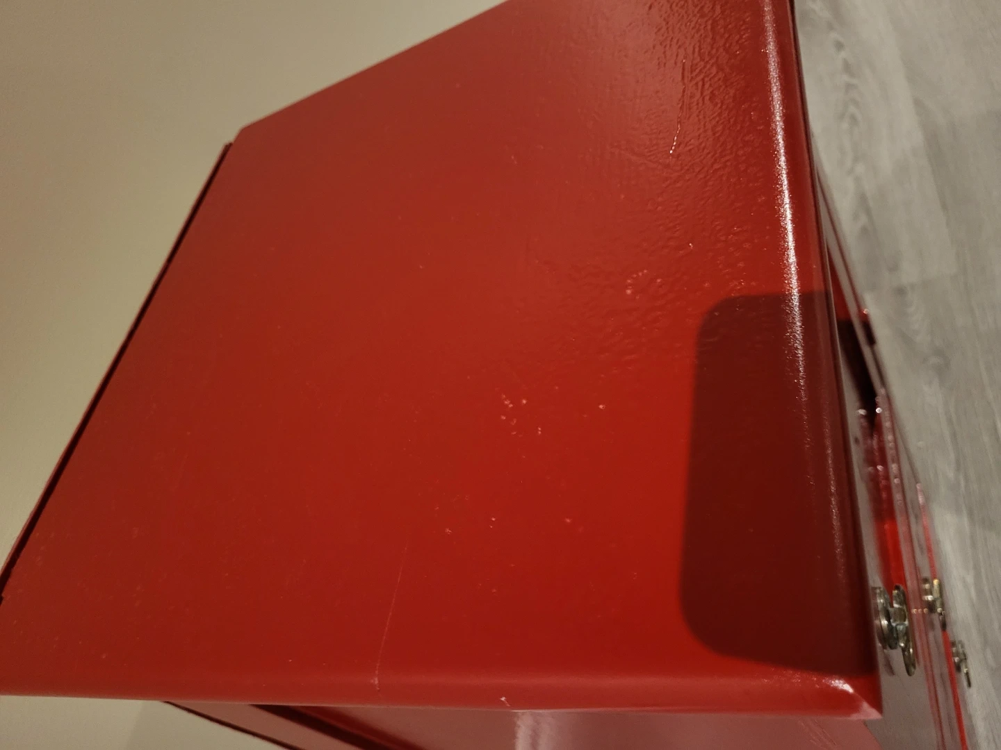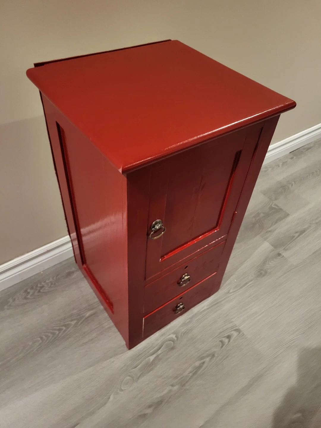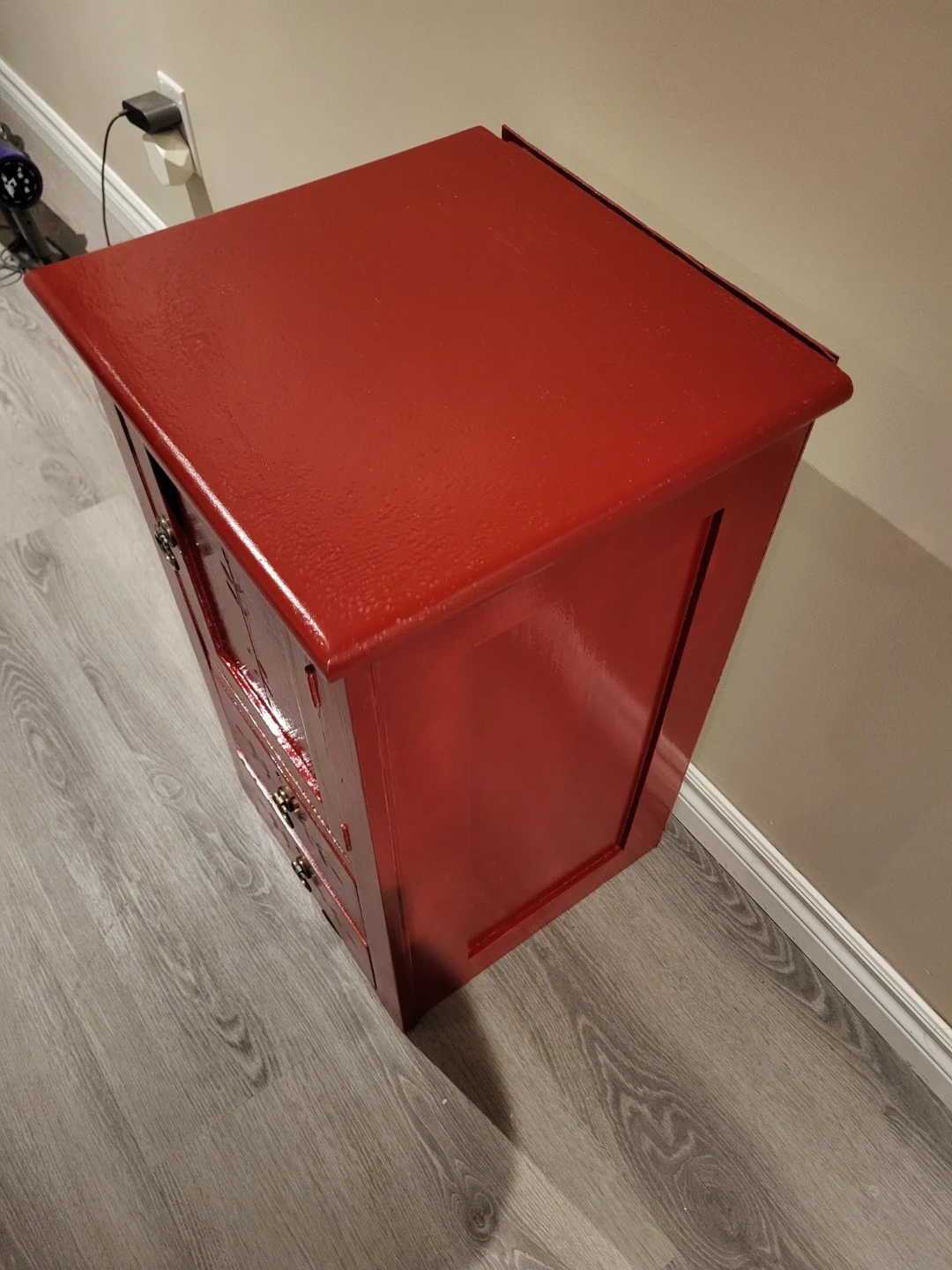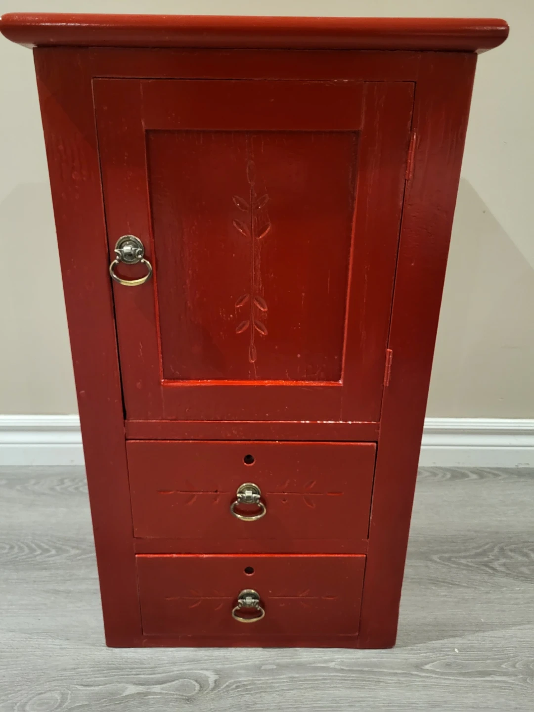 Red accent cabinet with one door and three drawers. Decorative carving on the door panel. Chrome-finished drawer pulls and door handle. Missing the key, but has the skeleton key locks.
