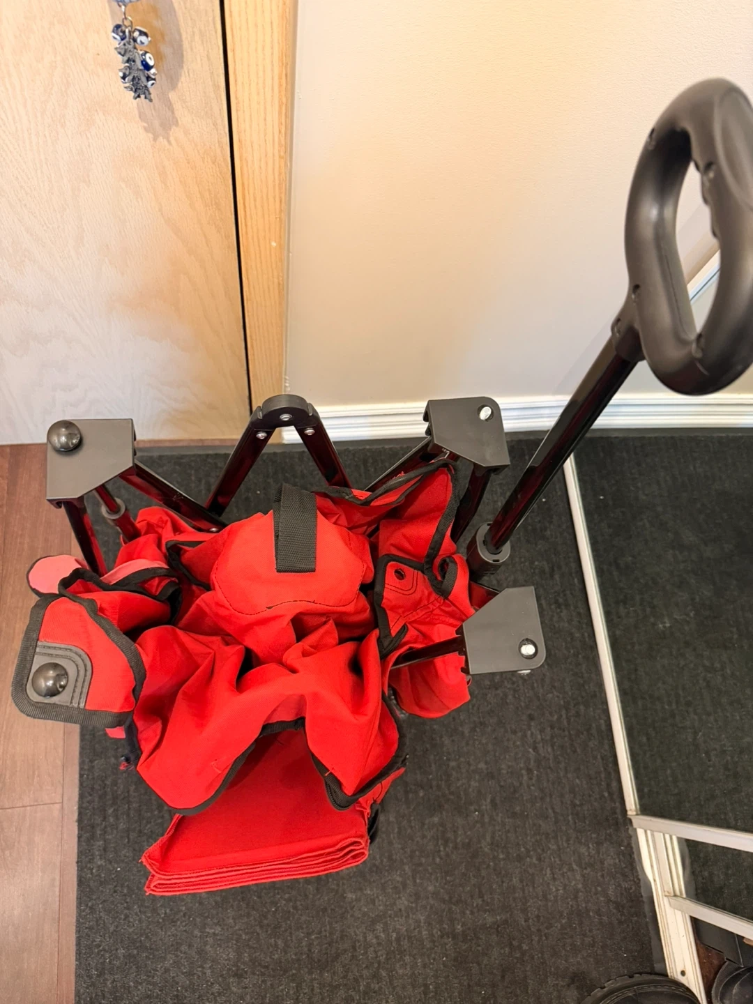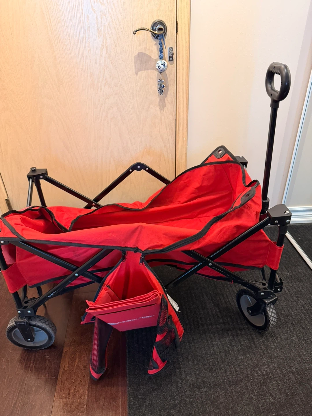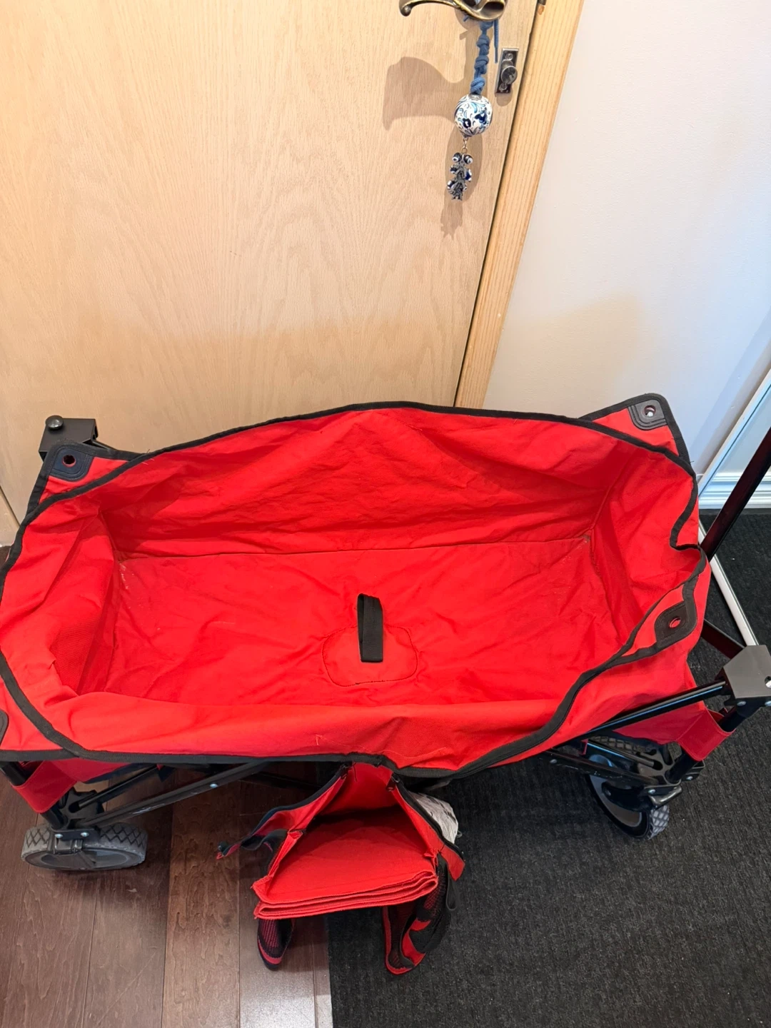 Red folding utility wagon in good working condition. Folds easily and rolls smoothly.