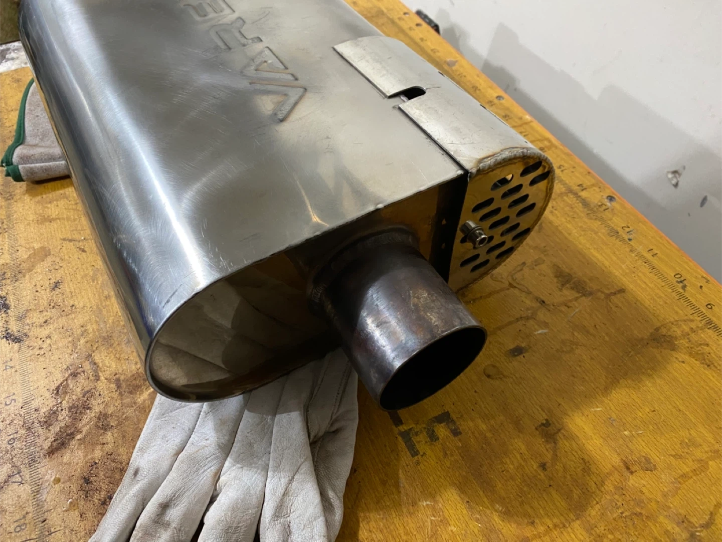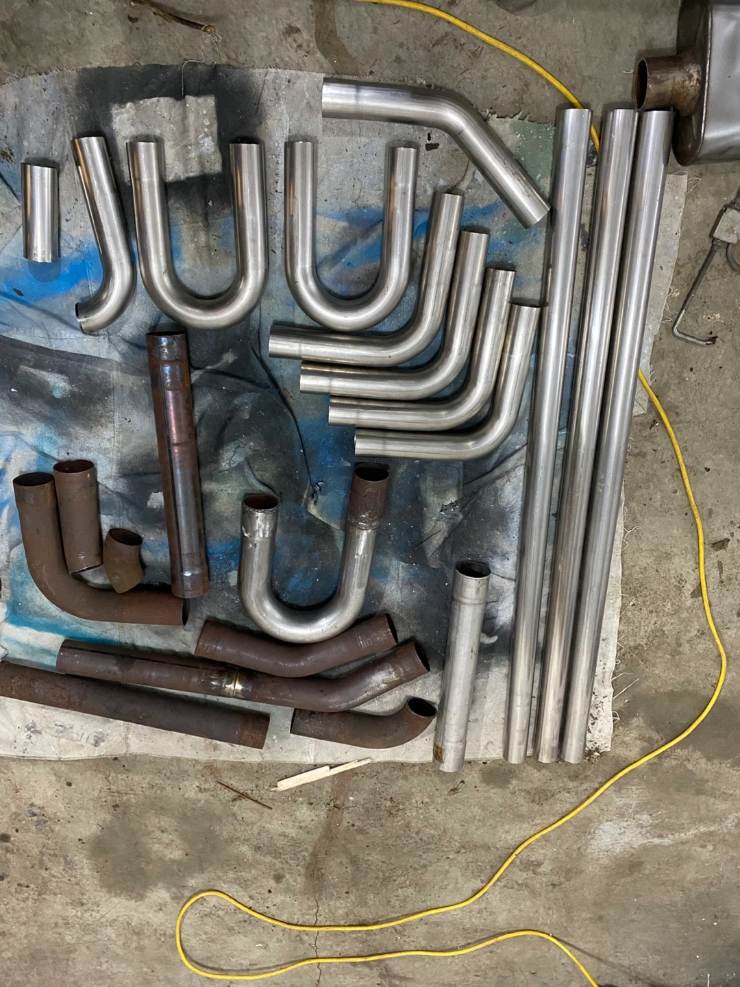 XForce Varex Oval 4"x9"x13" polished stainless steel hidden motor muffler. It has a 2-1/2" inlet/outlet, making it universal. The muffler comes with a switch that is wired your car battery, it is not remote control it is on a rocker switch all comes in the package. 2 1/2 exhaust pipe most of it has surface rust I also have 2 inch exhaust tubing witch is in perfect condition just didn’t need all of it. Lots of exhaust flanges and caskets. There are clamps mostly 2 1/2 and hangers. There is one exhaust tip that fits 2 inch to 2 1/2inch inlet it is also resonated. The muffler sounds great together but upgrading to a 3 inch exhaust system.