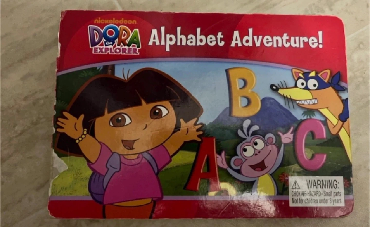 Nickelodeon Dora the Explorer Alphabet Adventure! board book. It's designed to help little ones learn the alphabet. Warning: Choking hazard β small parts. Not for children under 3 years.