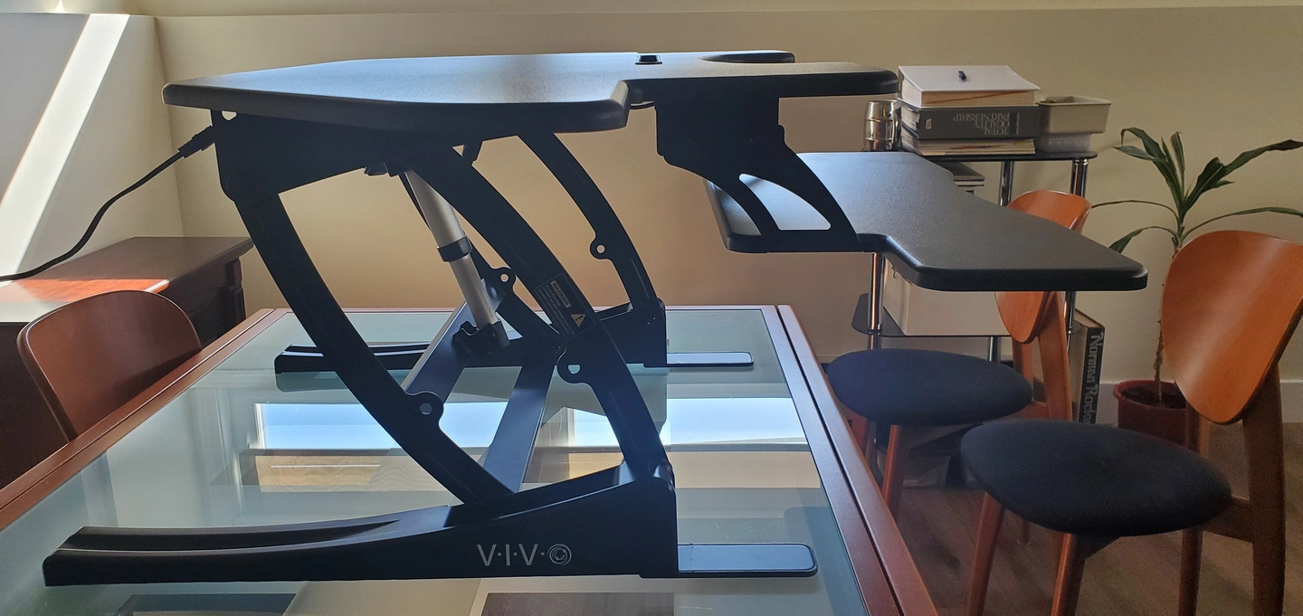 Corner electric stand up desk. Minimum height 6" above the desk it is placed on. Maximum height 16.5" above the desk it is placed on. Built in USB port beside the up/down button.