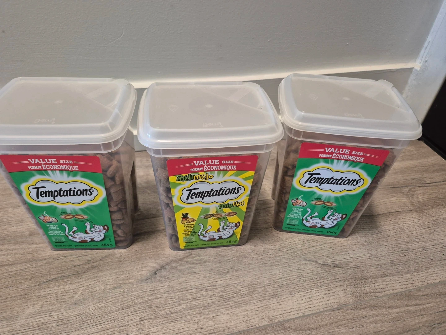 Three value-sized containers of Temptations cat treats. Each container is 454g. Includes MixUps, Seafood Medley, and Catnip flavors.
