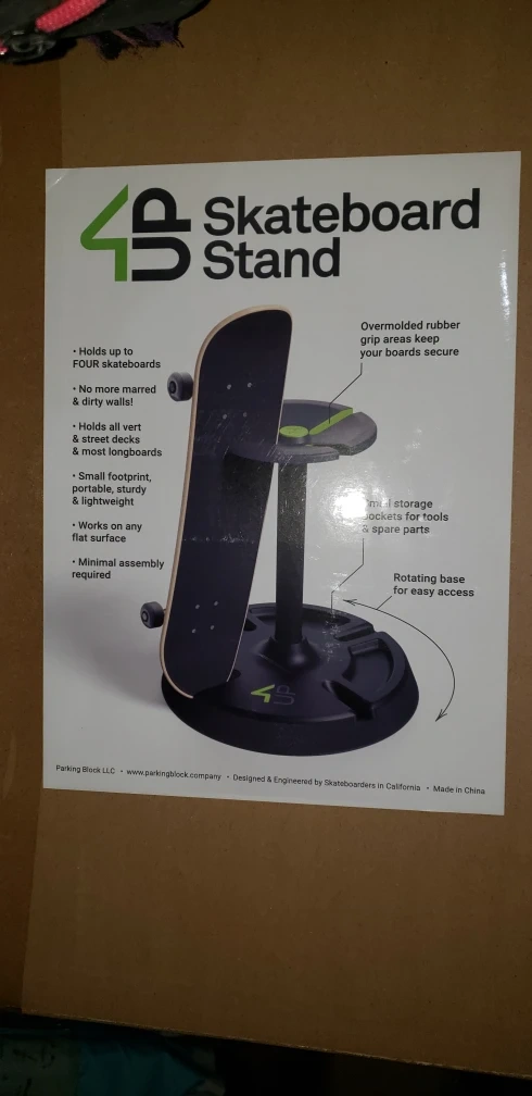 15I'm selling a 4D Skateboard Stand! It holds up to four skateboards, so you can say goodbye to marred and dirty walls. It's designed to hold all vert and street decks, and even most longboards. The stand has a small footprint, making it portable, sturdy, and lightweight. It works on any flat surface and requires minimal assembly. Plus, it has overmolded rubber grip areas to keep your boards secure, storage pockets for tools and spare parts, and a rotating base for easy access