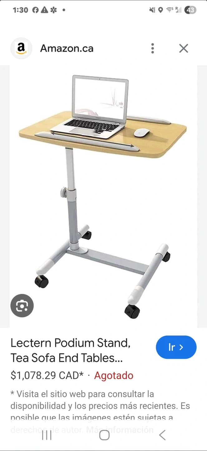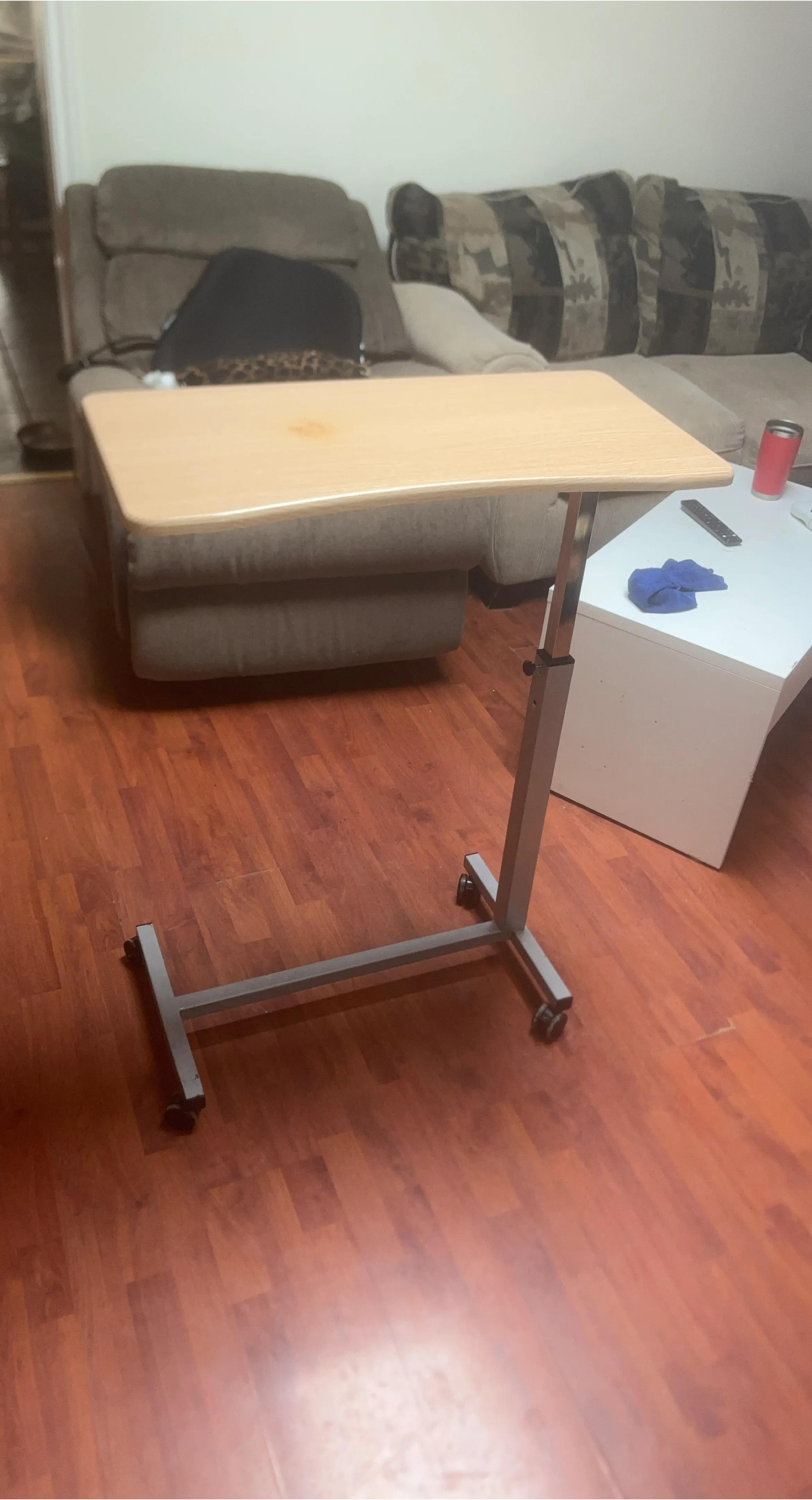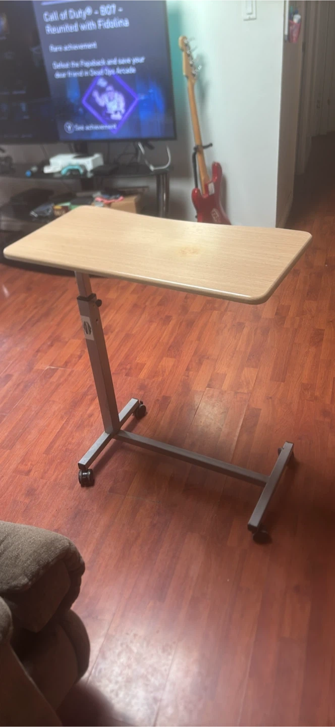 This is an adjustable height rolling desk with a light wood-look tabletop. It's easy to move around on its casters. The height can be adjusted to suit your needs.