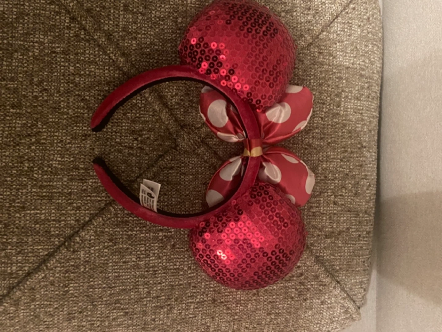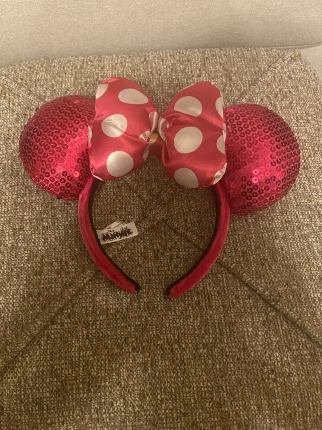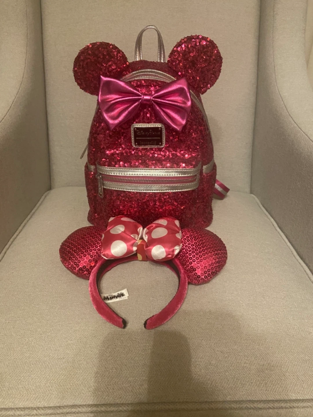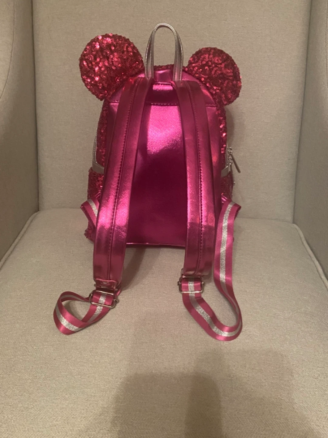 Only used twice. This dazzling pink sequin backpack features Minnie Mouse ears and a signature bow. It has adjustable straps for comfort and a zippered front pocket for essentials. The interior lining has a fun polka dot pattern. It's perfect for theme park visits or everyday adventures! The ears are technically child sized, but fit smaller adults fine.