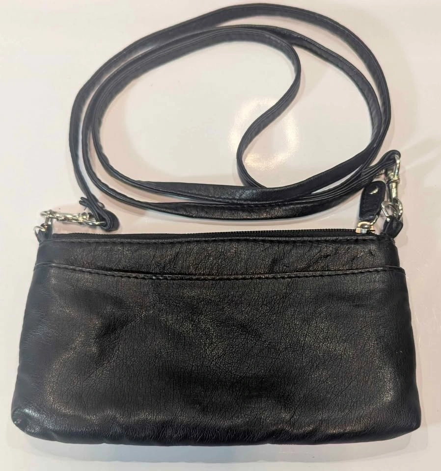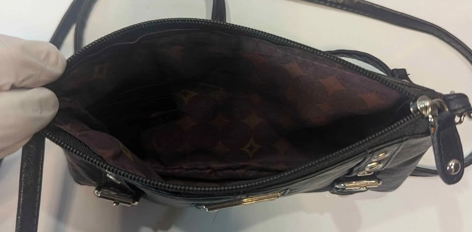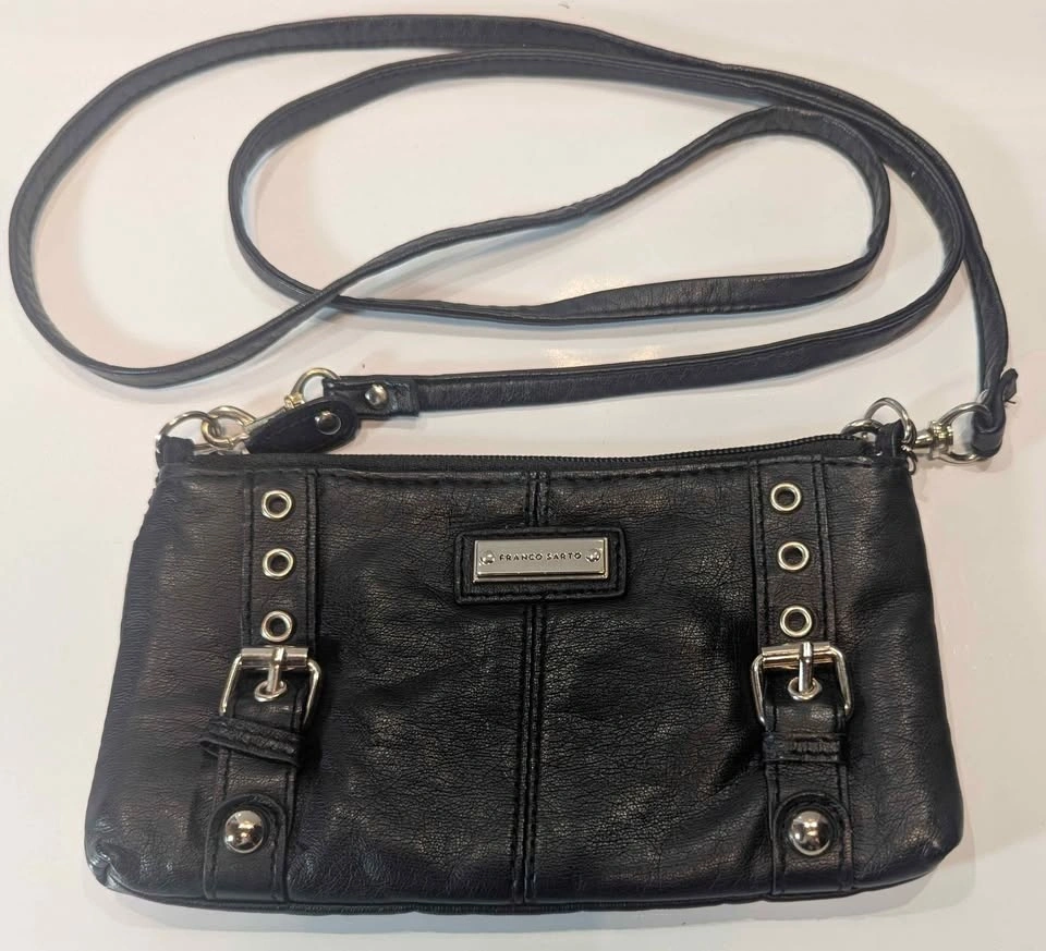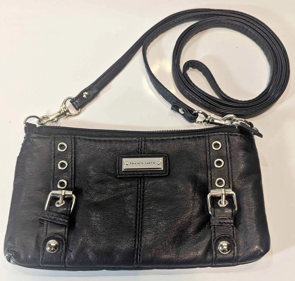 Step out in effortless Italian-inspired style with this stunning crossbody from Franco Sarto. Known for blending high-fashion aesthetics with everyday practicality, this piece is the perfect addition to a modern wardrobe. This bag features a sophisticated pebbled texture in a versatile midnight black. The design is anchored by bold, high-polish silver-tone hardware, including a signature double-buckle front and triple-grommet detailing. It’s a piece that offers a hint of "rocker chic" while remaining perfectly polished for professional or evening wear. This item is Brand New, maintaining its original structure and flawless finish. Expertly crafted from high-grade PVC, offering superior durability. It is naturally water-resistant and scratch-resistant, ensuring it stays looking new regardless of the weather. Designed for the woman on the go, its slim profile (7" x 4") is ideally sized for your smartphone, cards, and daily essentials without adding bulk. The main compartment is fully lined with Franco Sarto’s premium patterned textile, providing a luxury experience every time you reach for your keys. Franco Sarto accessories are celebrated for providing "attainable luxury" without compromising on design. Original Retail Value: Between $85 and $110 CAD. Whether you’re looking for a reliable daily companion or a stylish gift, this brand-new Franco Sarto crossbody delivers designer prestige and long-lasting quality.