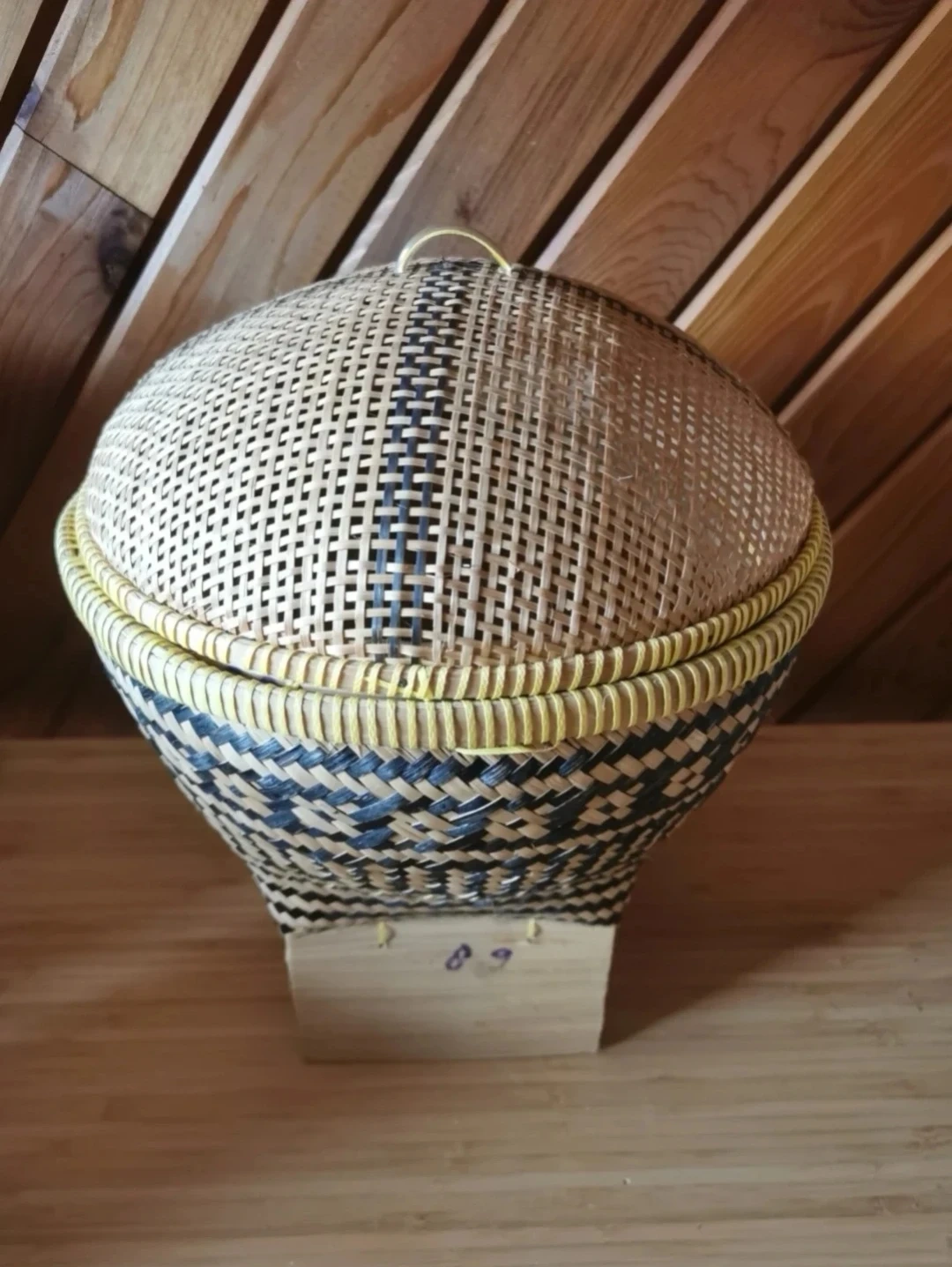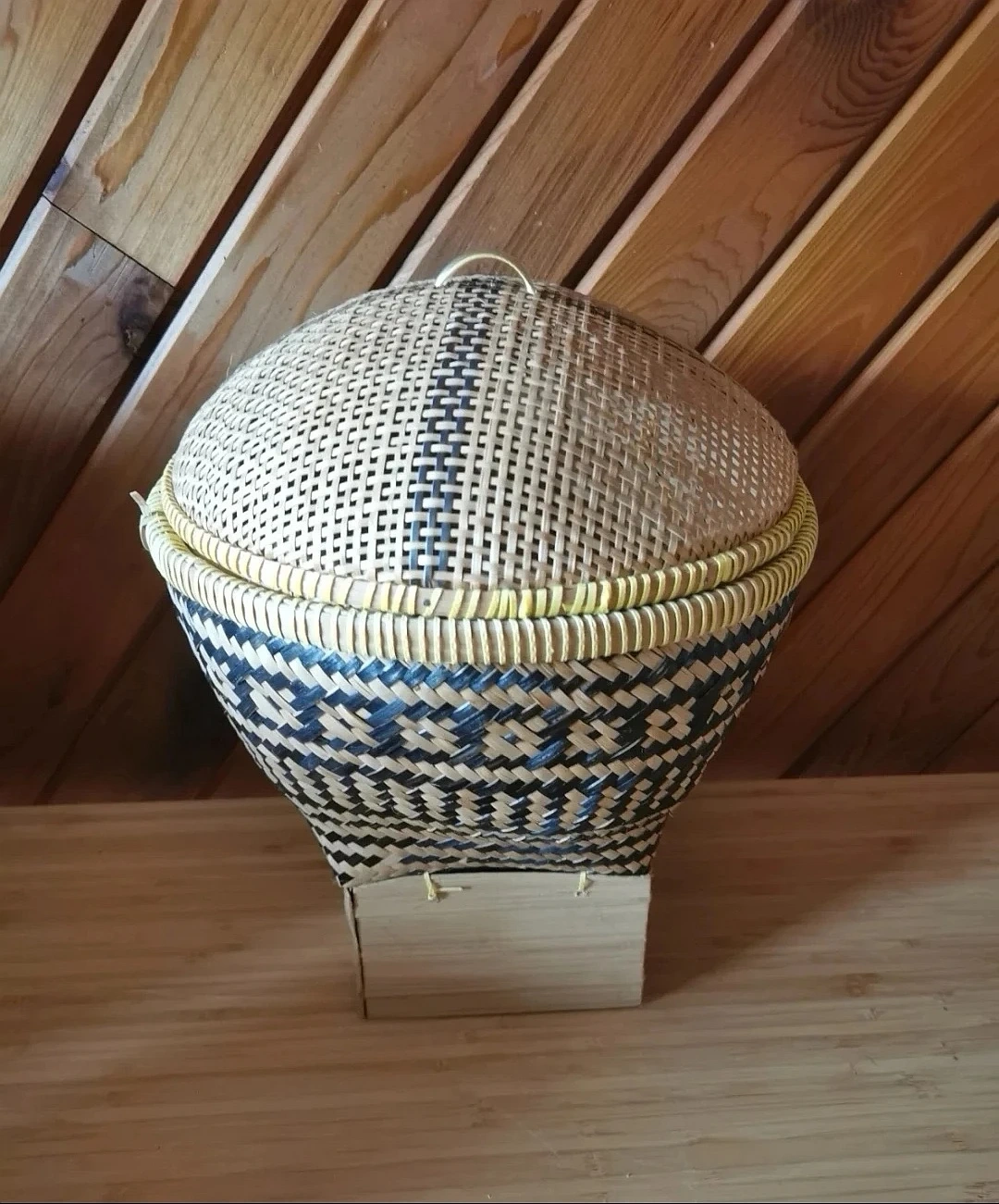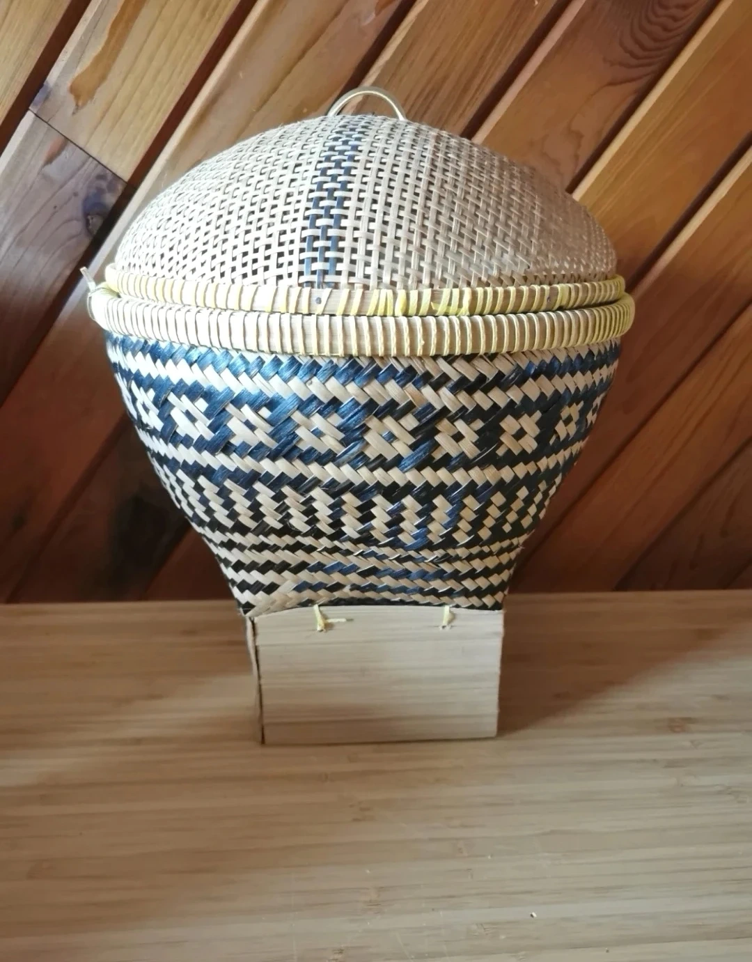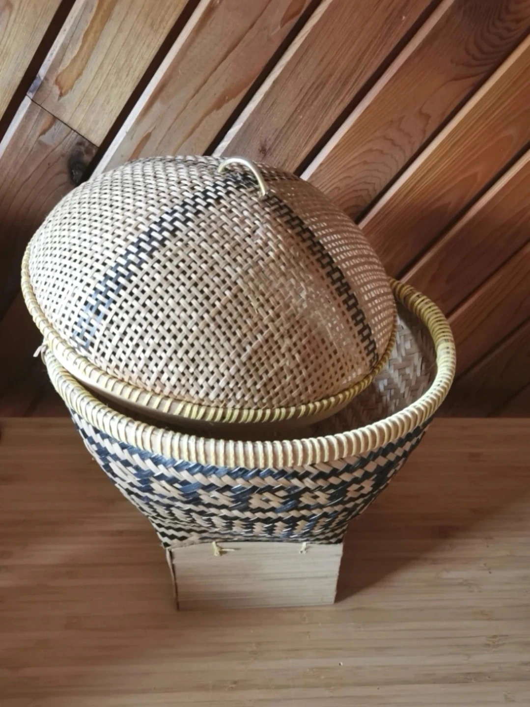 Traditionally used for serving or storing rice, corn, fruits, or vegetables, this basket is both functional and decorative. The domed lid helps keep contents protected, while the included wooden stand elevates the piece for display.