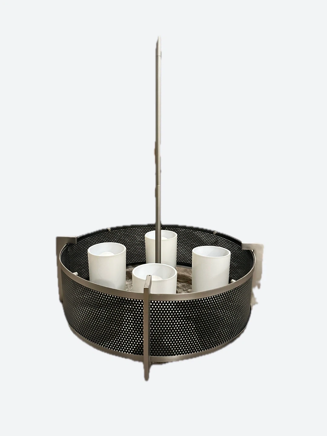 This modern pendant light fixture features a circular drum shade with a perforated metal accent. It includes four white glass shades to diffuse light. This fixture would add a stylish touch to any living room or dining area.