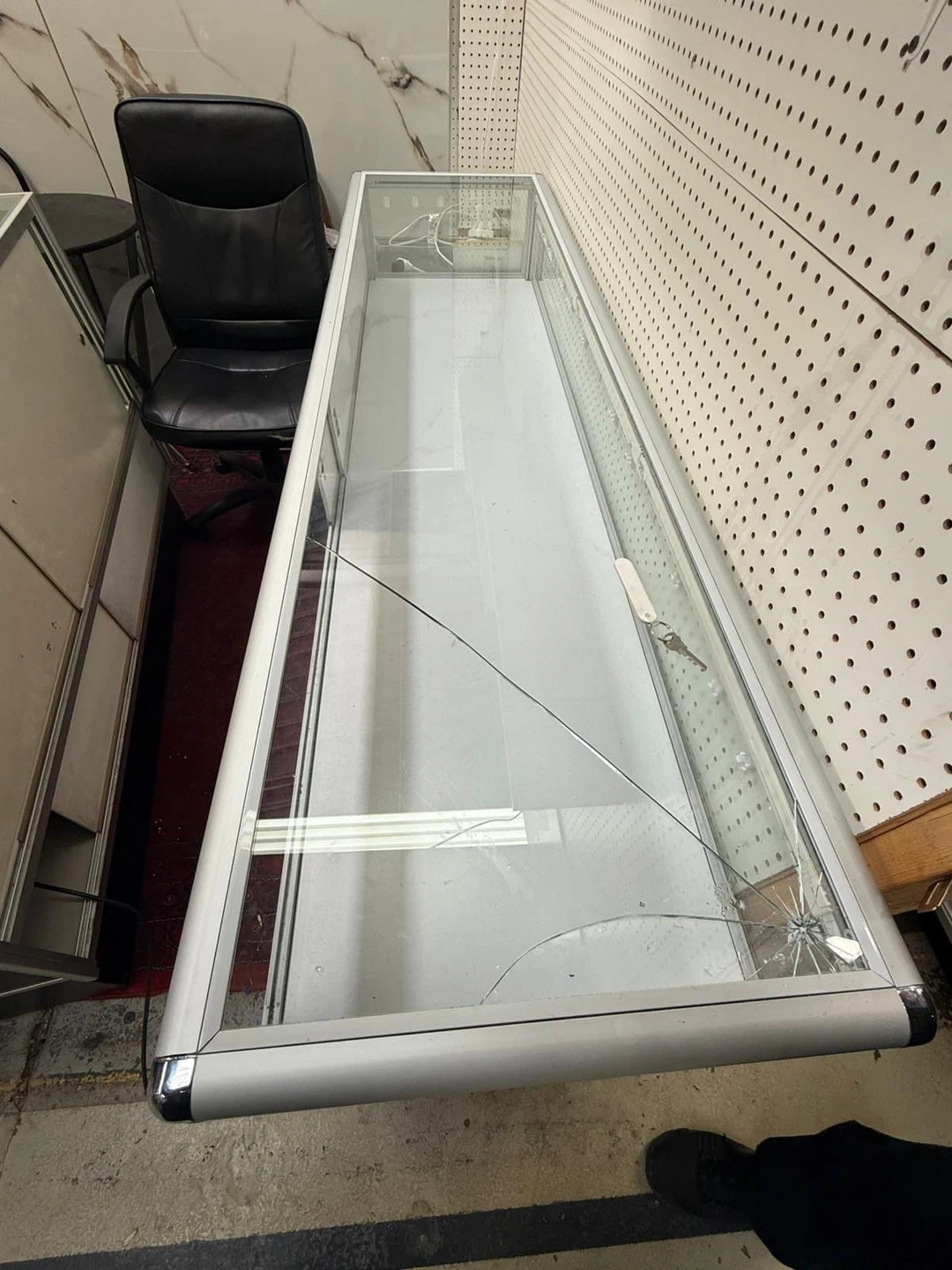 A commercial display showcase counter with a glass top and silver aluminum trim. It features a storage compartment underneath. The glass has some cracks and damage. This unit is ideal for retail environments like jewelry stores or convenience shops. It's a functional piece for displaying merchandise.