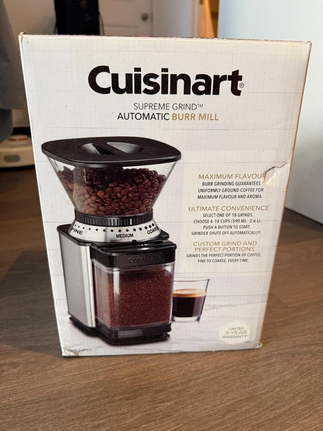Selling a Cuisinart Supreme Grind Automatic Burr Mill. It's in great shape and ready to grind your favourite beans! The box states that it guarantees uniformly ground coffee for maximum flavour and aroma. It also offers ultimate convenience, allowing you to select one of 18 grinds and choose 4-18 cups. It also grinds the perfect portion of coffee, from fine to coarse, every time