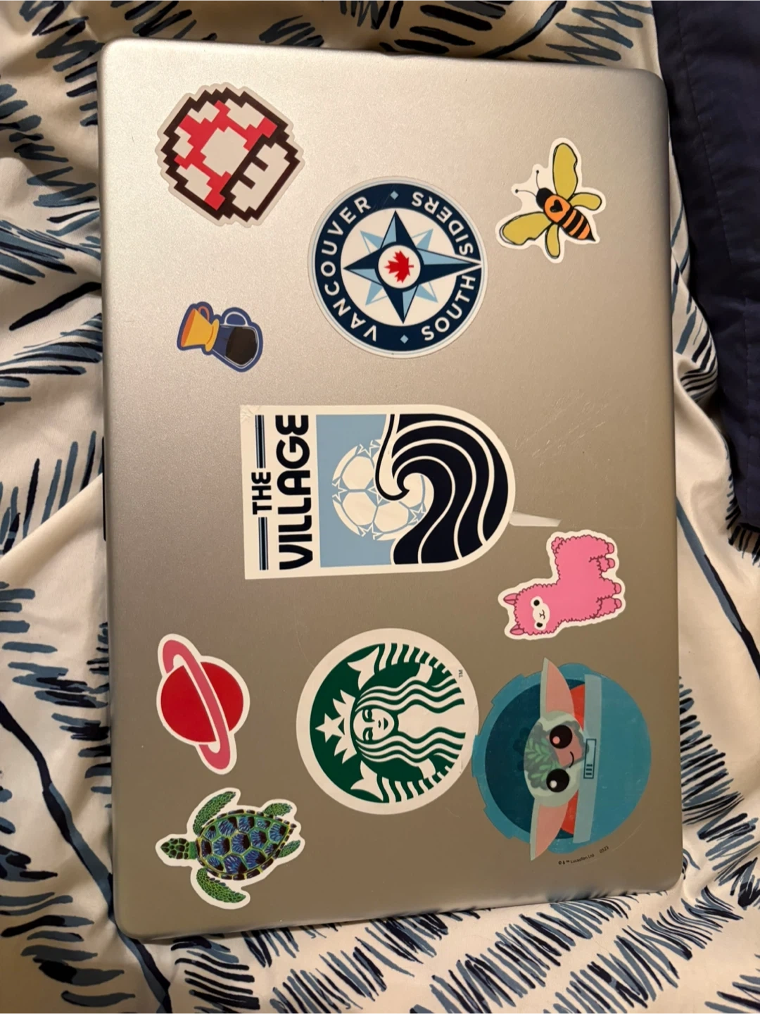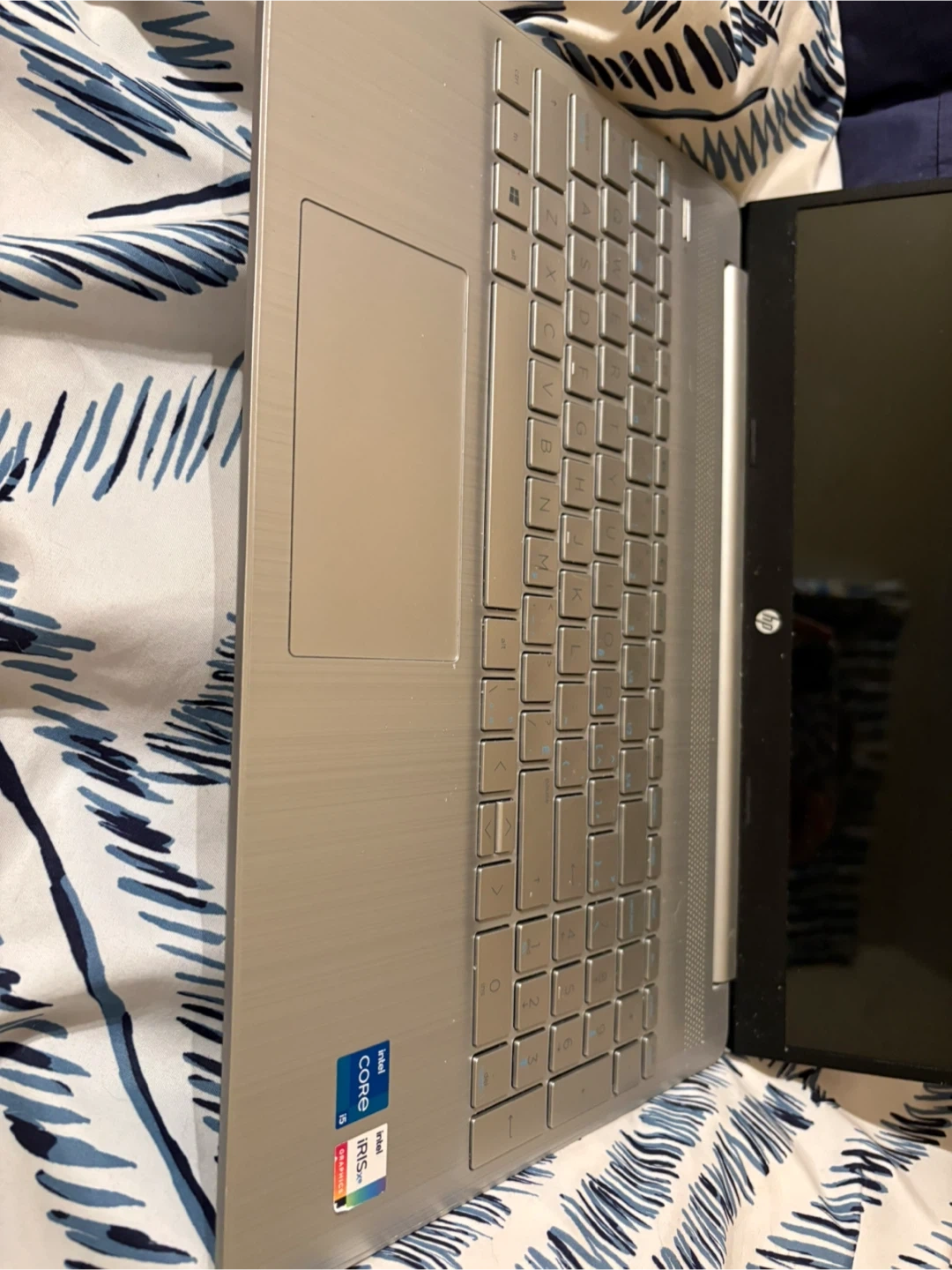 This is an HP laptop in silver. It features an Intel Core i5 processor. The laptop is decorated with various stickers. Used, great for school, comes with charger, I can take off the stickers if needed