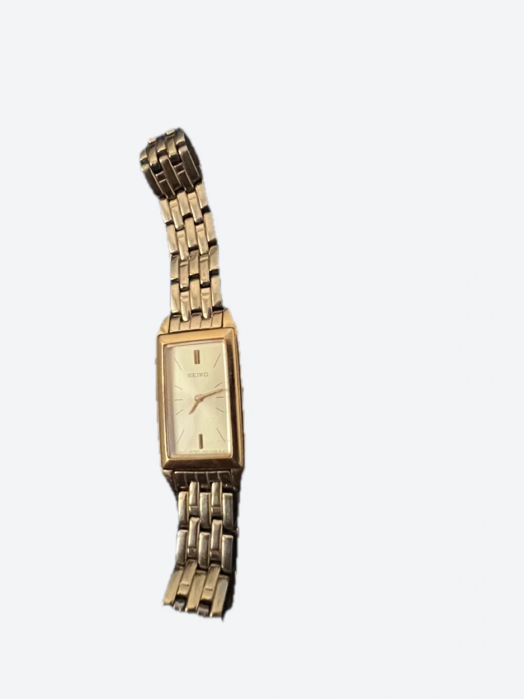 Elegant Seiko women's watch with a gold-tone finish. Features a rectangular face and a classic link bracelet. Perfect for adding a touch of sophistication to any outfit!