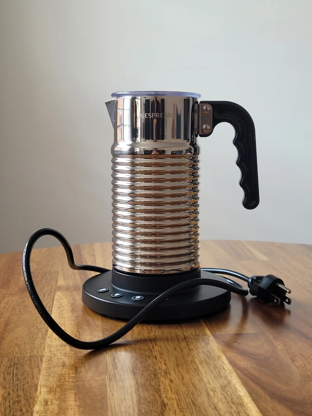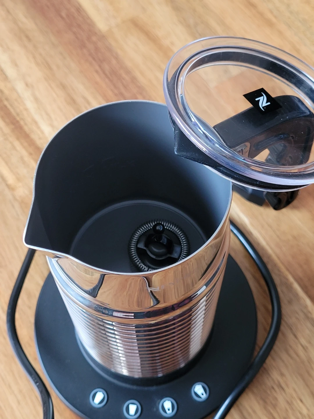 Main jug has a chrome finish and black ergonomic handle. Separates from the base, where you can choose between four options of hot and cold foams. Whisk attaches to the base via a magnet.