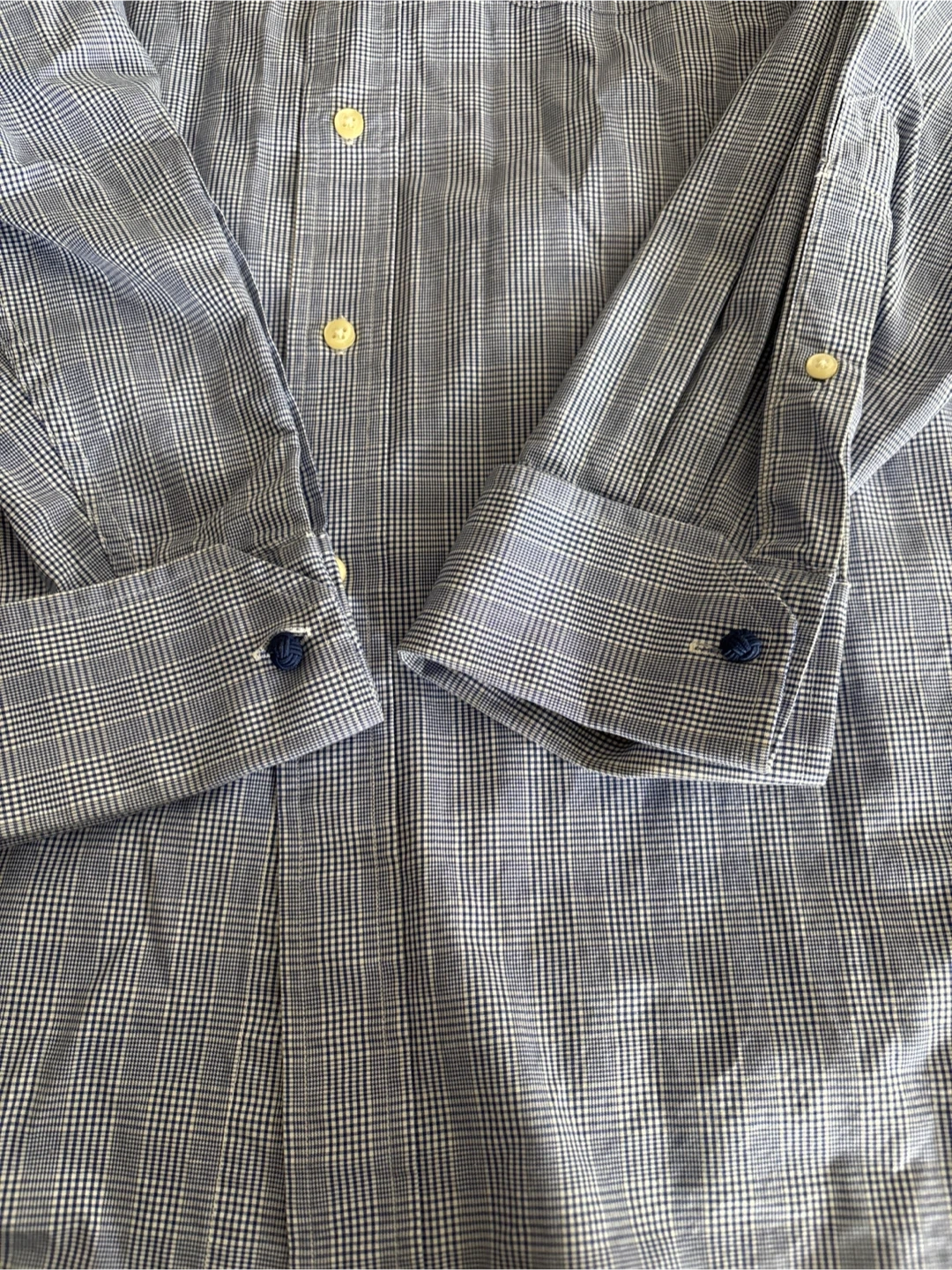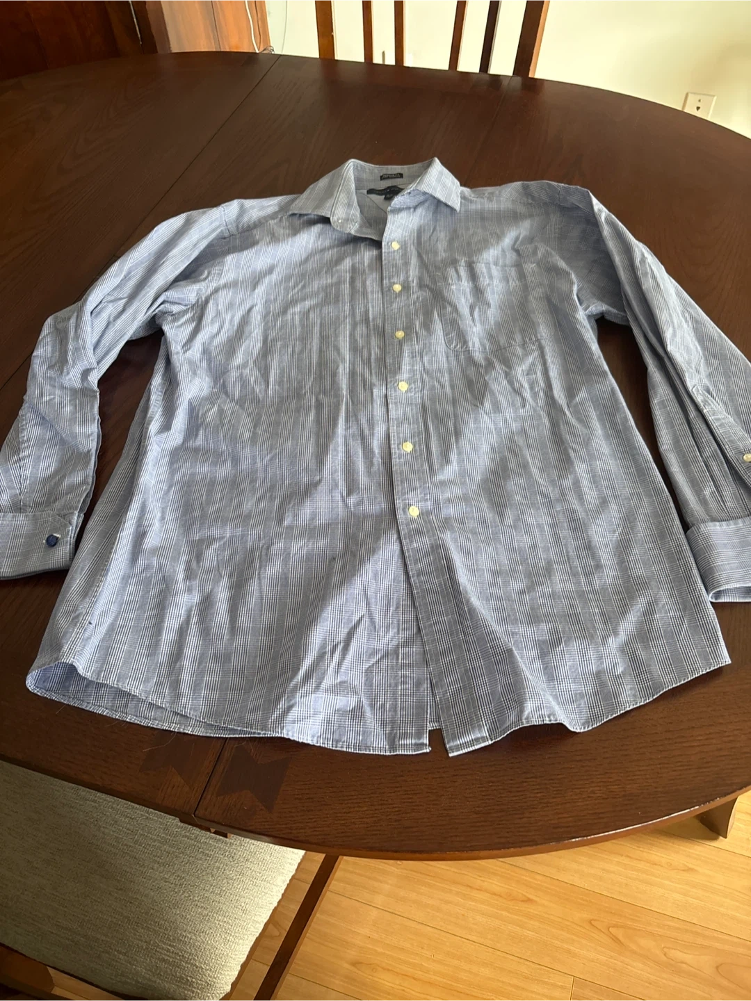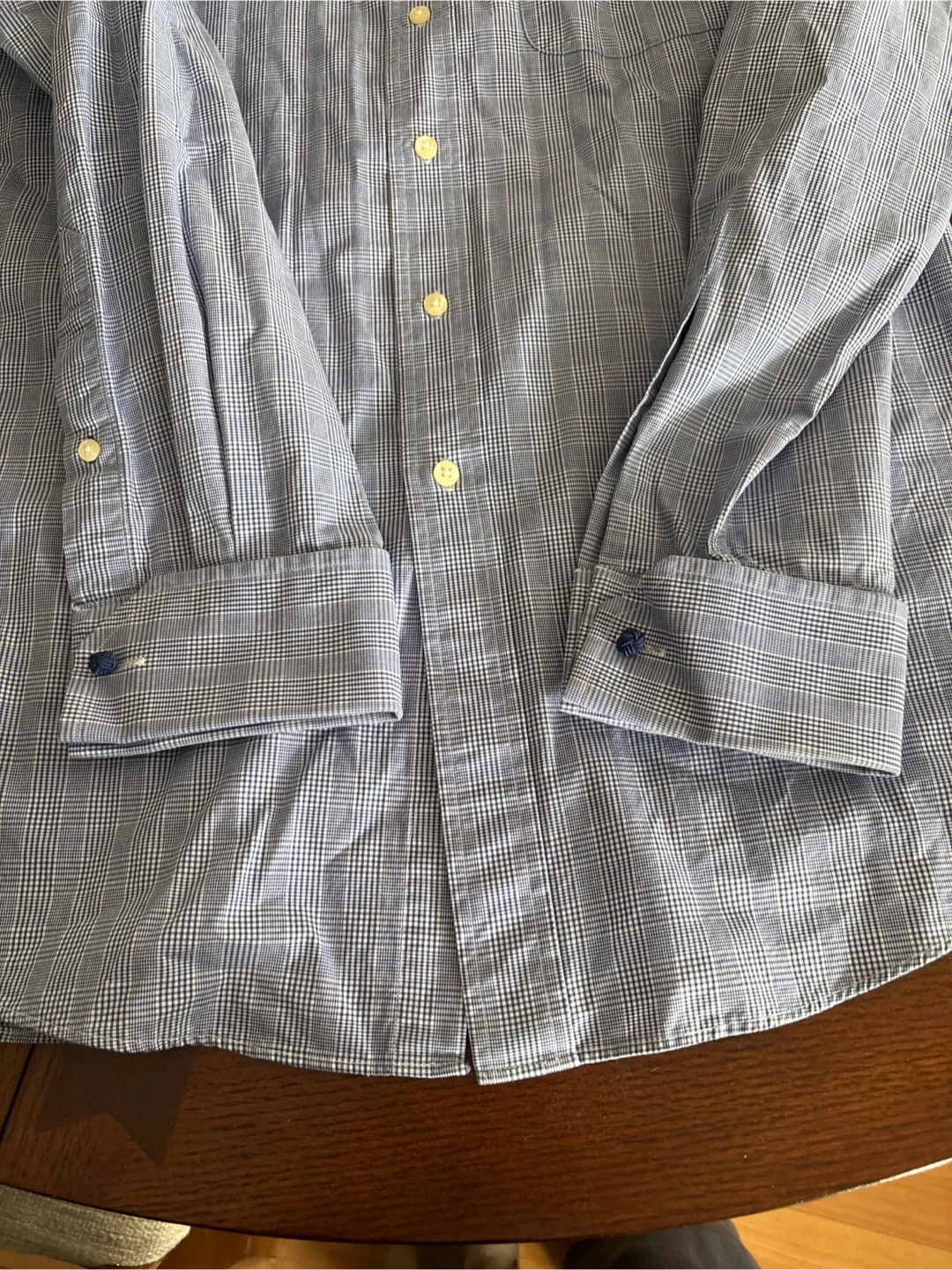 Tommy Hilfiger long-sleeve dress shirt. It's a regular fit in size medium with a blue plaid pattern. Made from a blend for comfort.