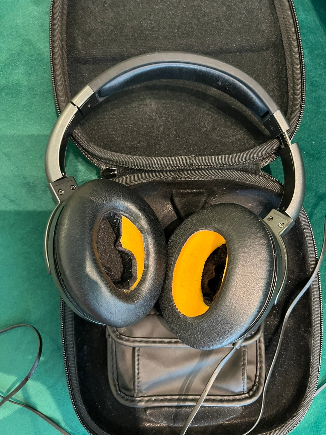 Selling a pair of 233621 headphones. They come with a carrying case, perfect for keeping them safe when you're on the go! The earcups show some wear, but they are still functional.