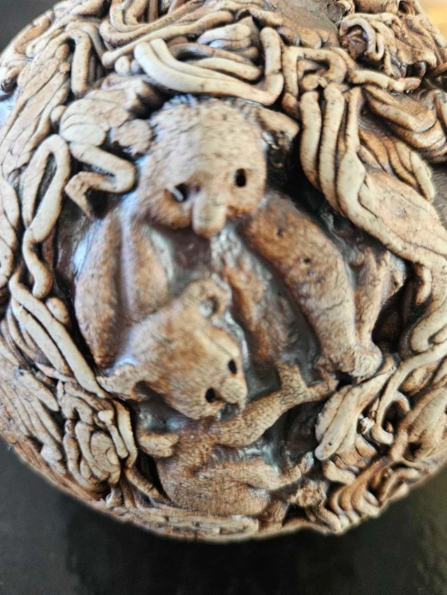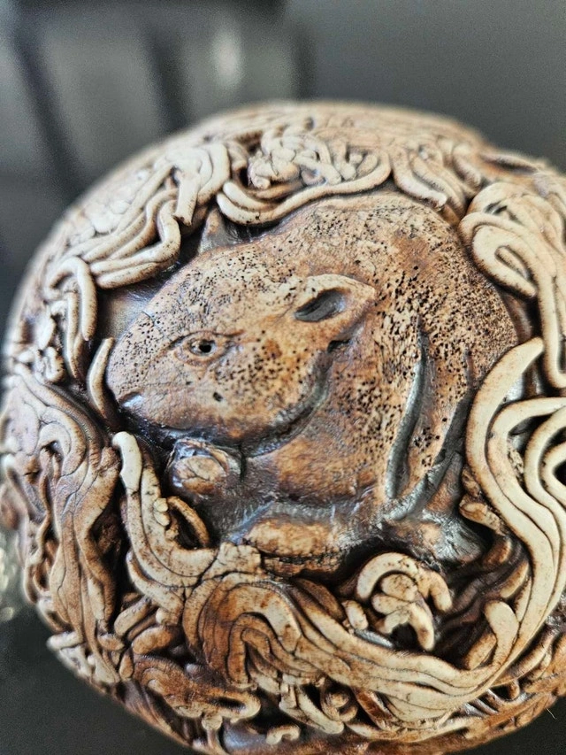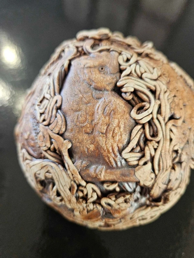 Unique and captivating, this a Art Ball showcases intricate animal designs, including koalas, owls, wombats and birds, making it a fascinating decorative piece. Its detailed craftsmanship and earthy tones add a touch of whimsy and nature-inspired charm to any space.
