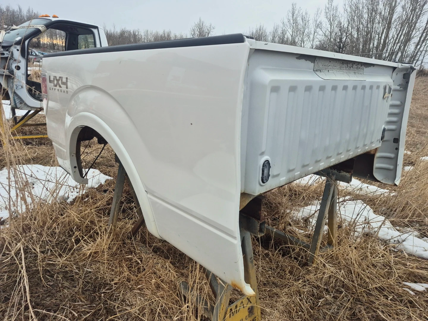 This is a off white truck bed with a 4x4 Off-Road decal. It's designed for a pickup truck. The interior has a spray-in bed liner.