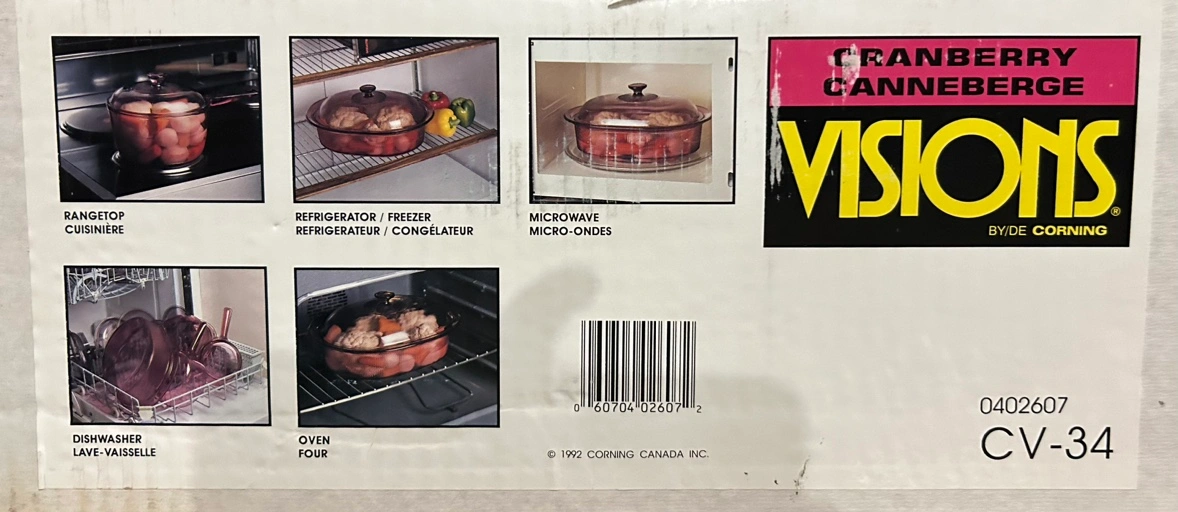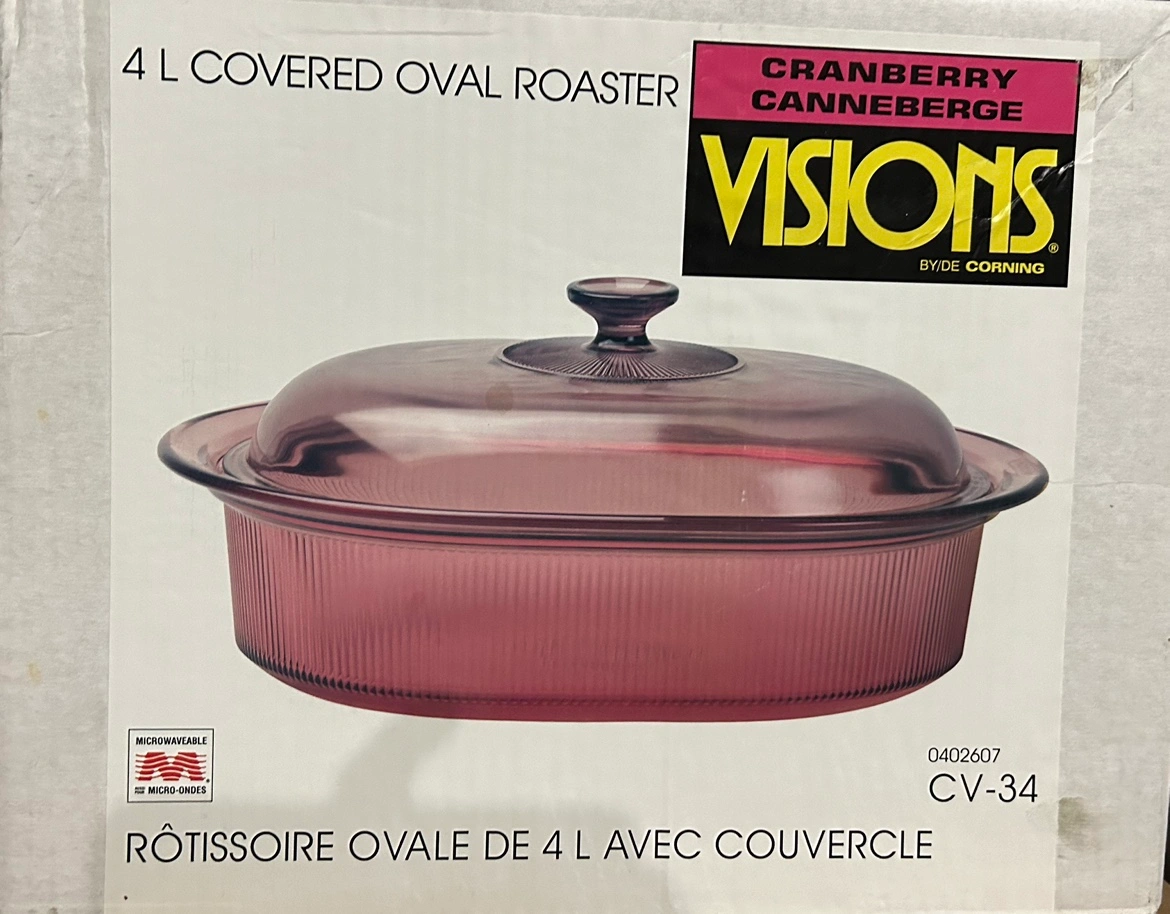 Vision 4L Cranberry Covered Roaster. Can be used in the oven, microwave, refrigerator/freezer, and dishwasher. Comes in original box.