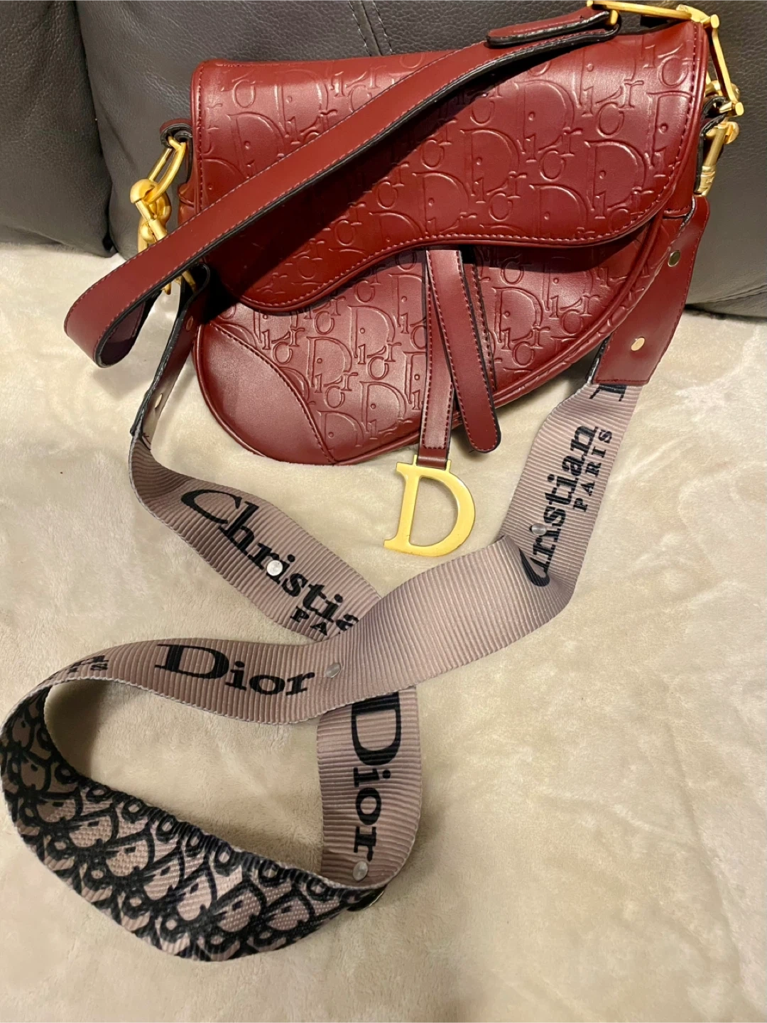 Dior Saddle Bag, featuring a distinctive saddle shape and the iconic Dior Oblique pattern embossed on the leather. The bag comes with a 'Christian Dior Paris' shoulder strap, adding a touch of modern elegance. It's a stylish and recognizable piece, perfect for adding a chic touch to any outfit.